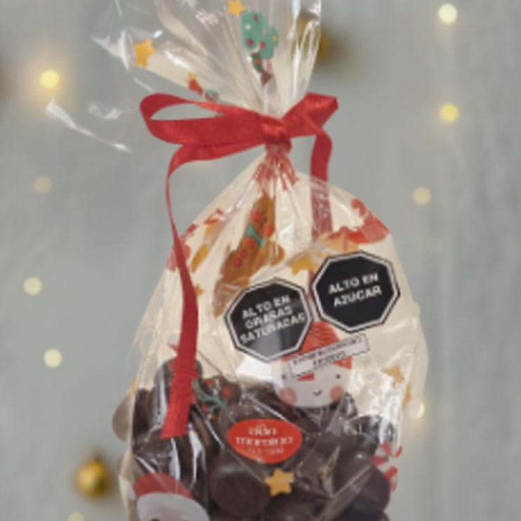Discos de chocolate de leche con frutos secos, paquete 100 gramos.