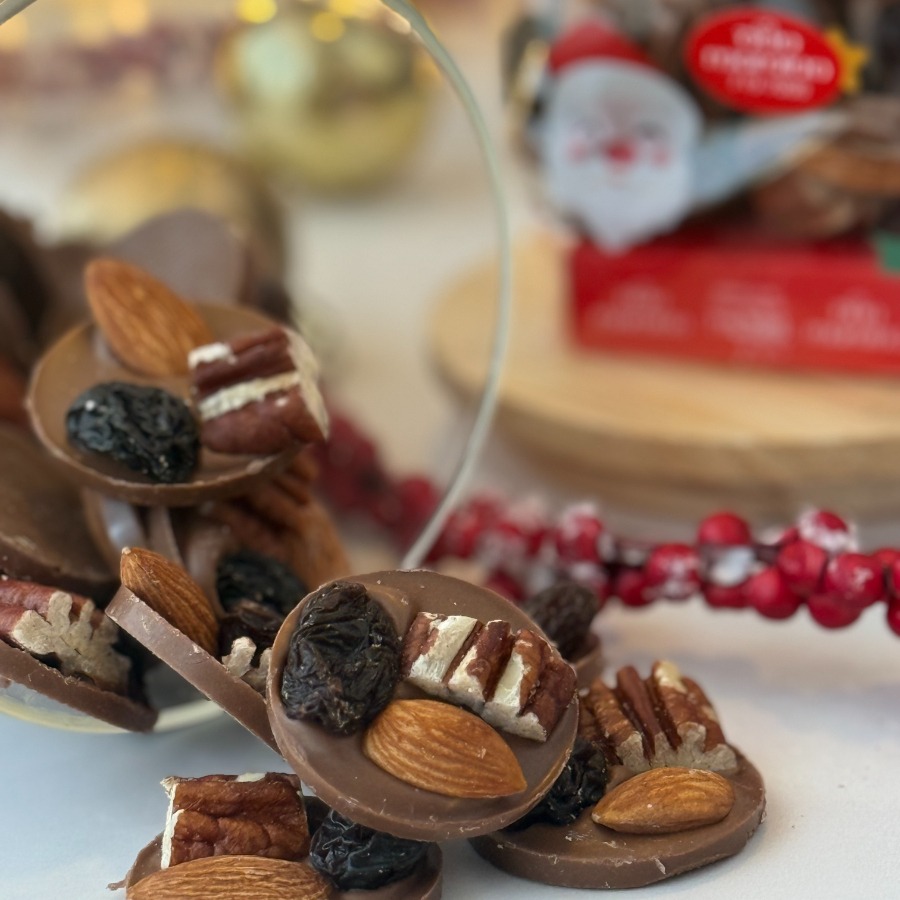 Discos de chocolate de leche con frutos secos en presentación de 100 gramos.