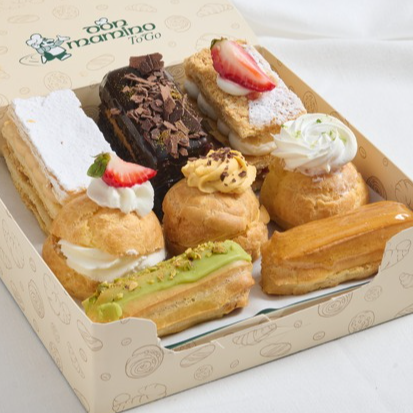 Contiene 8 dulces entre postres, profiteroles y relámpagos de sabores surtidos.
