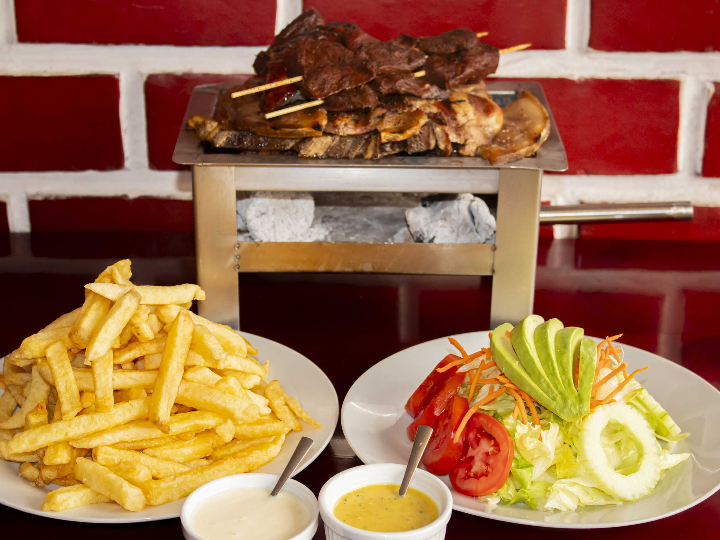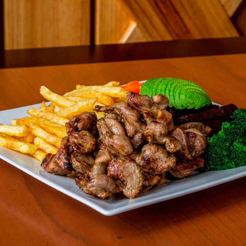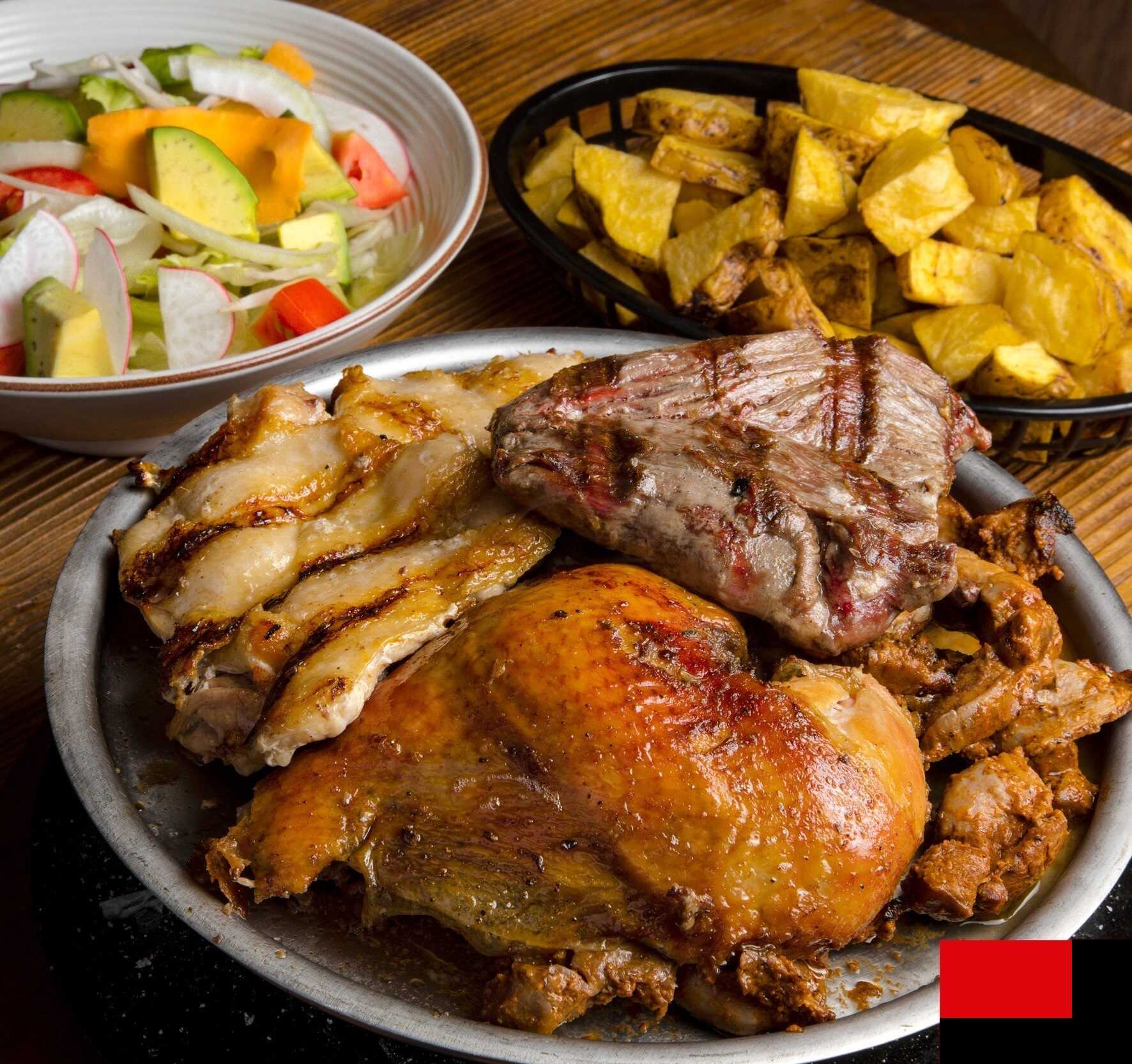 1 Lomo fino, 1 churrasco grande, 1 chuleta grande, 2 palitos de anticuchos, mollejitas, 1/4 de pollo a la leña, 1 chorizo, 1 pechuga, papas fritas y ensalada clásica.