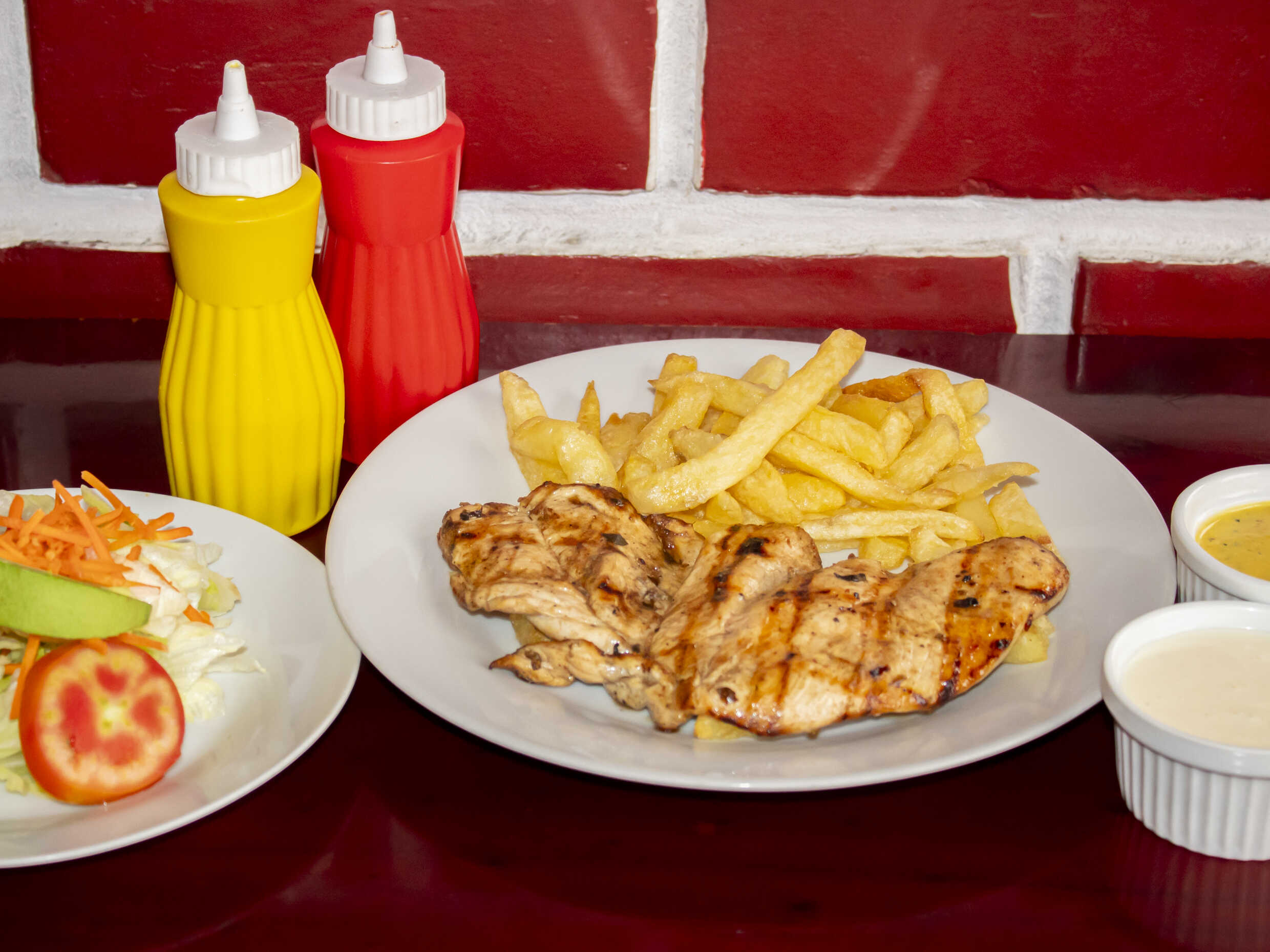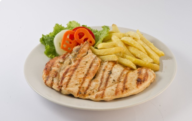 Filete de pechuga a la parrilla, papas fritas crocantes y ensalada.