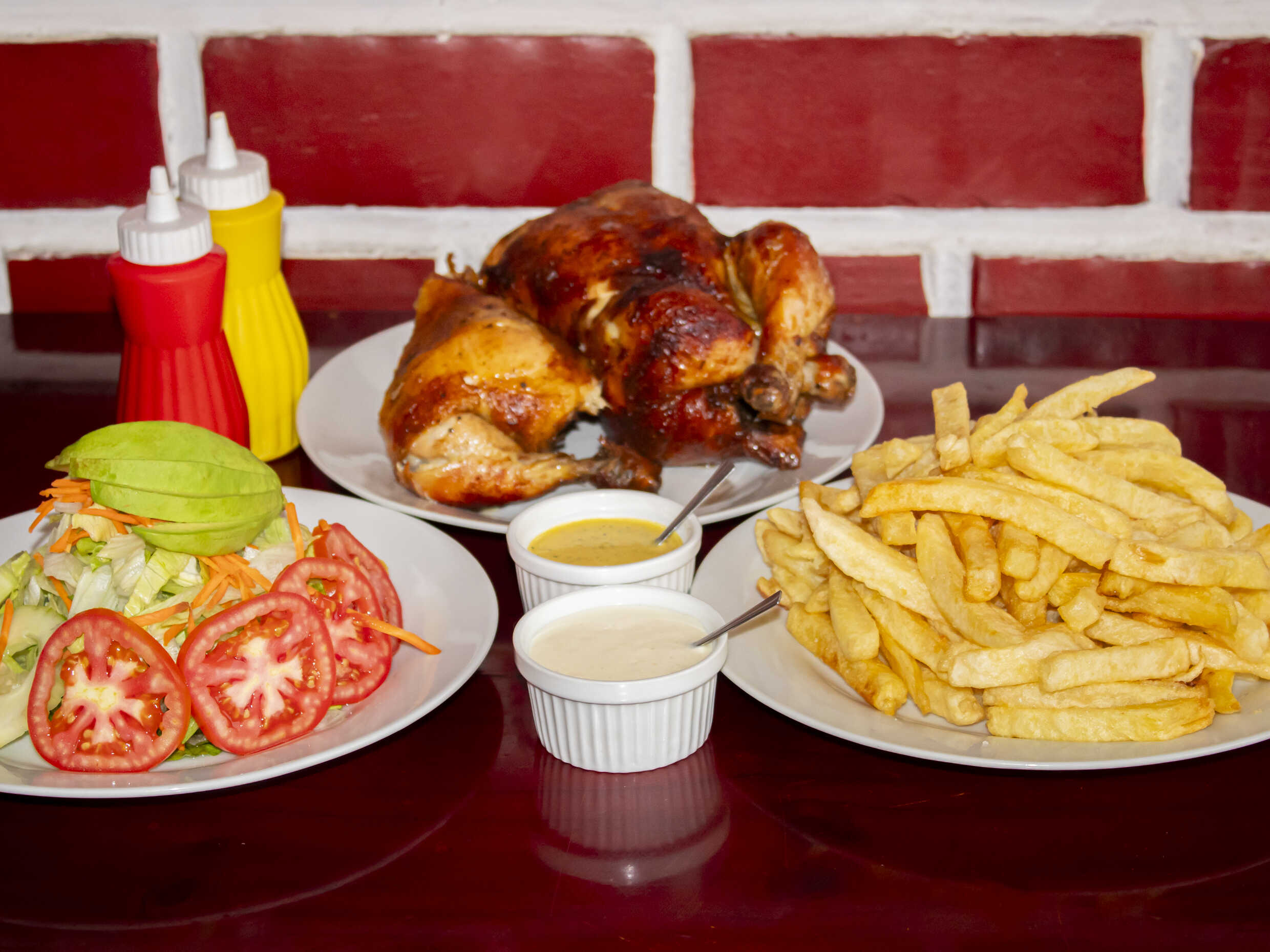1 Pollo a la leña, papas fritas crocantes, ensalada y cremas.