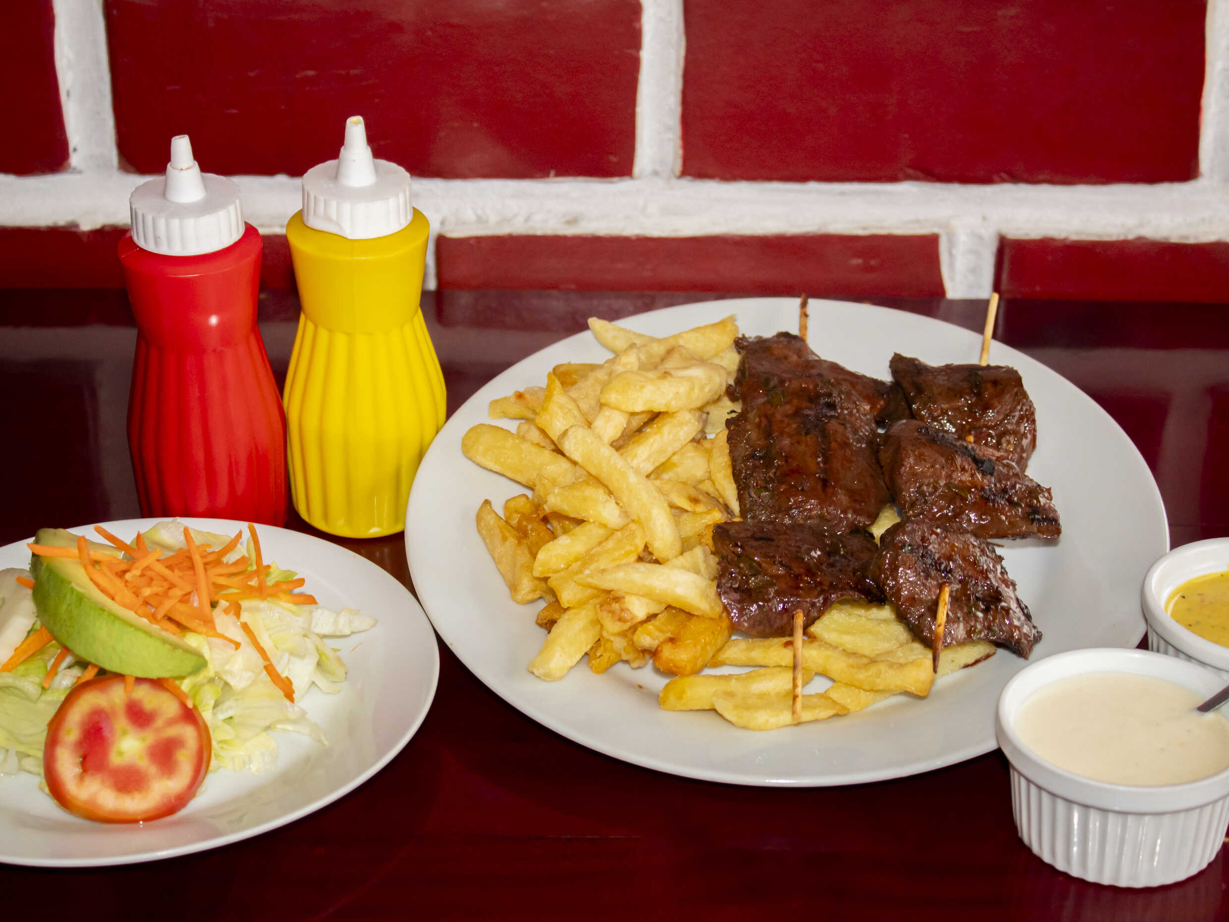 Churrasco de res a la parrilla, papas fritas y ensalada clásica.