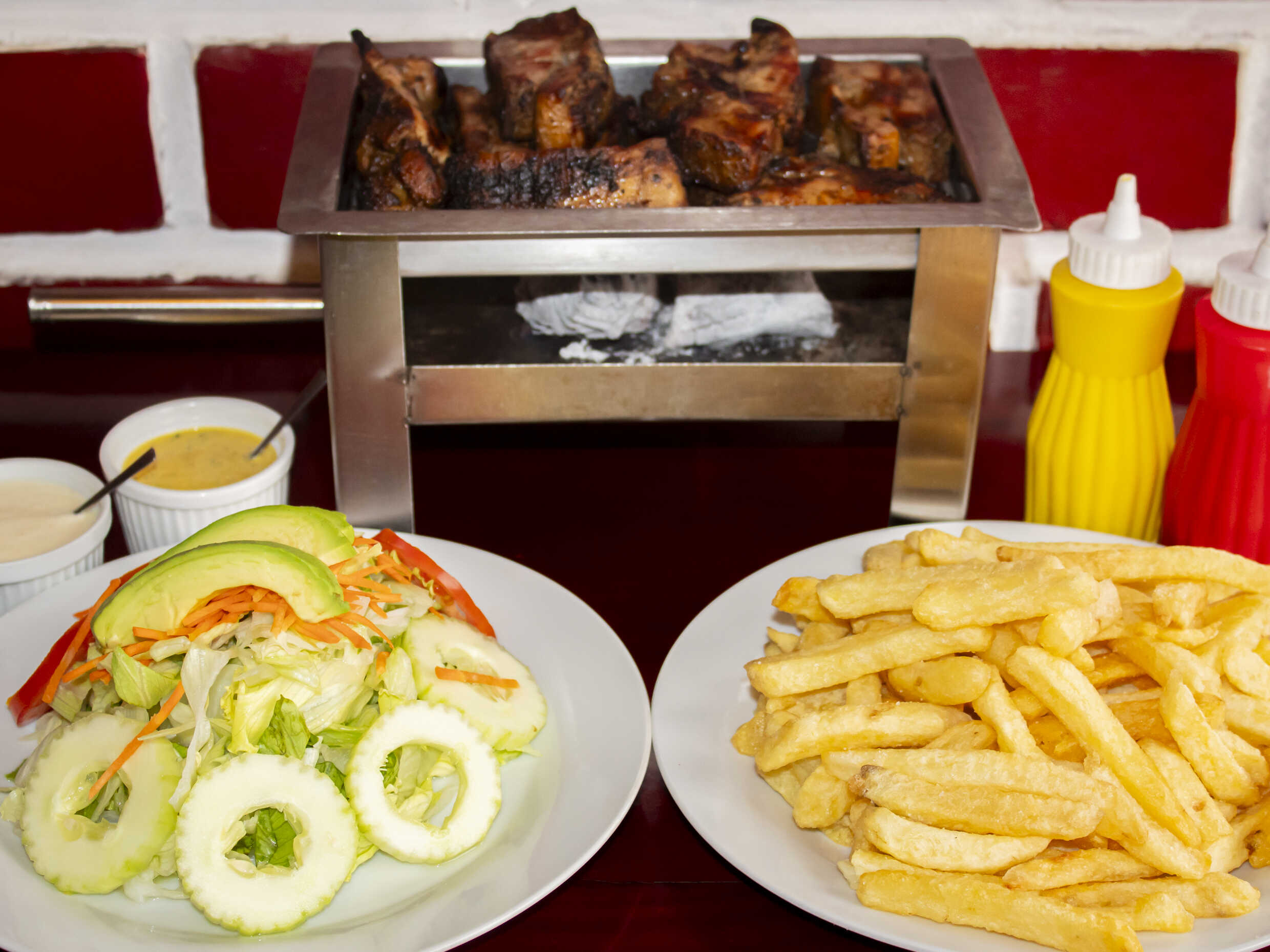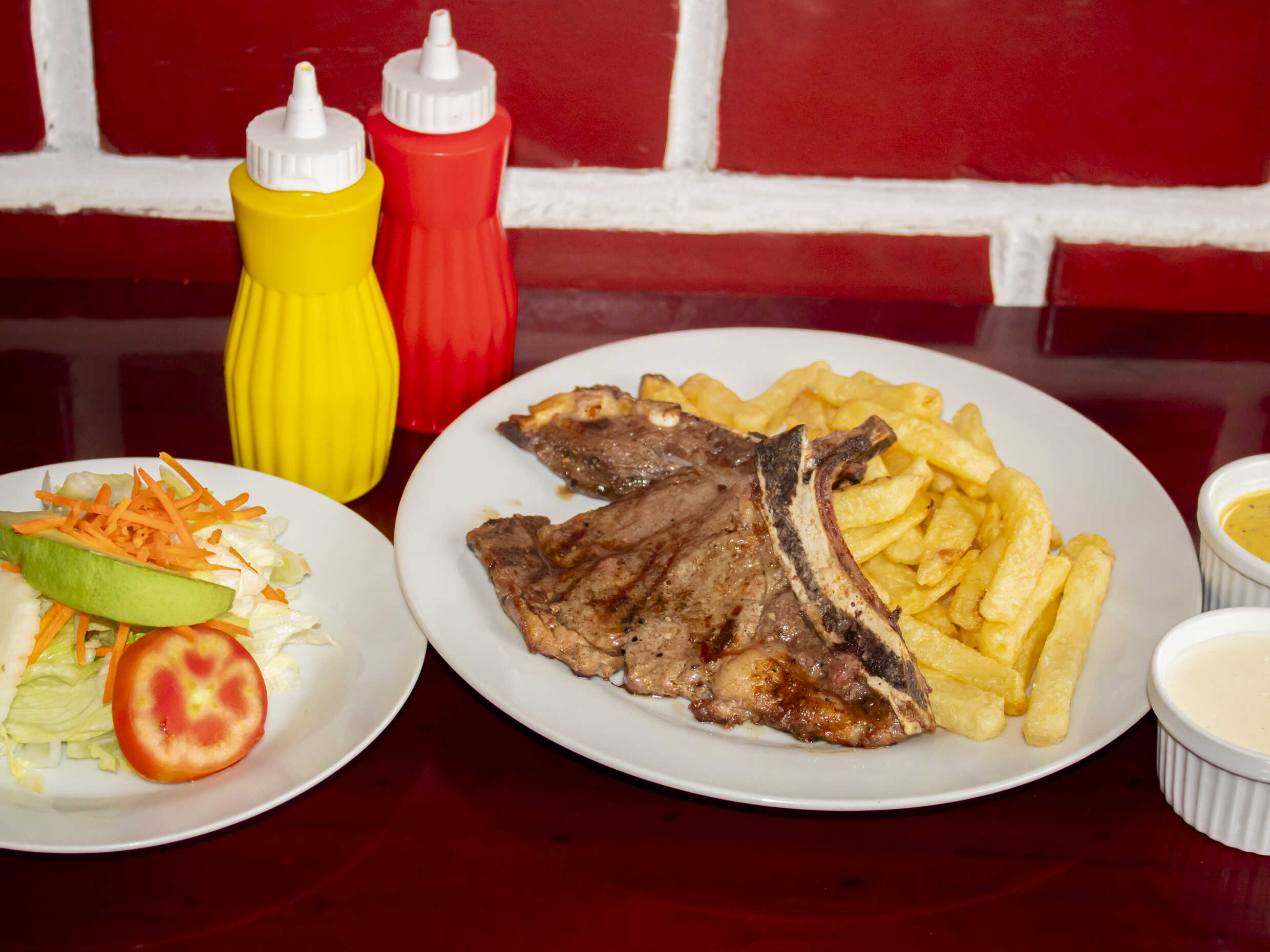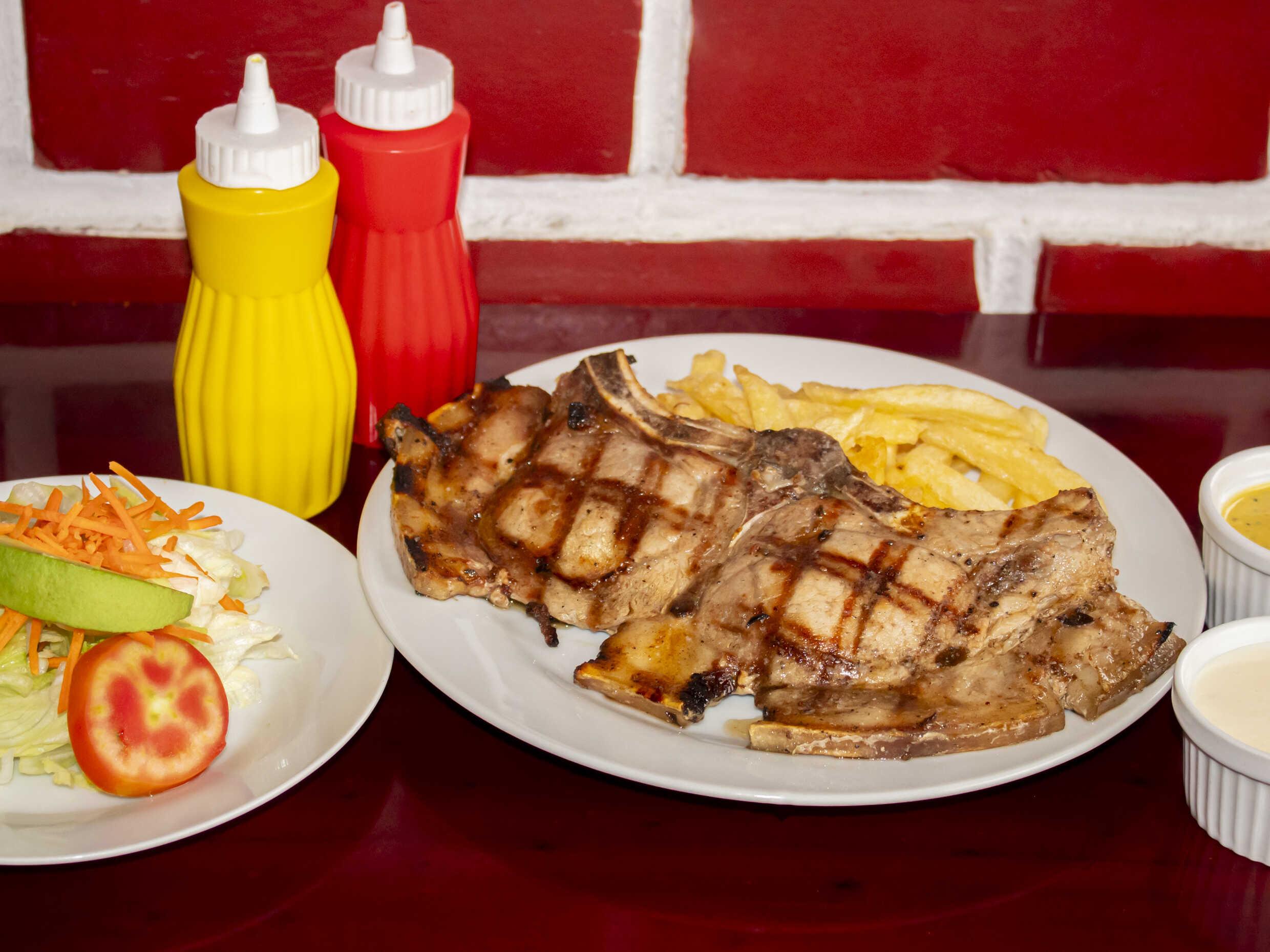 8 Costillas de cerdo a la parrilla, papas fritas y ensalada clásica.