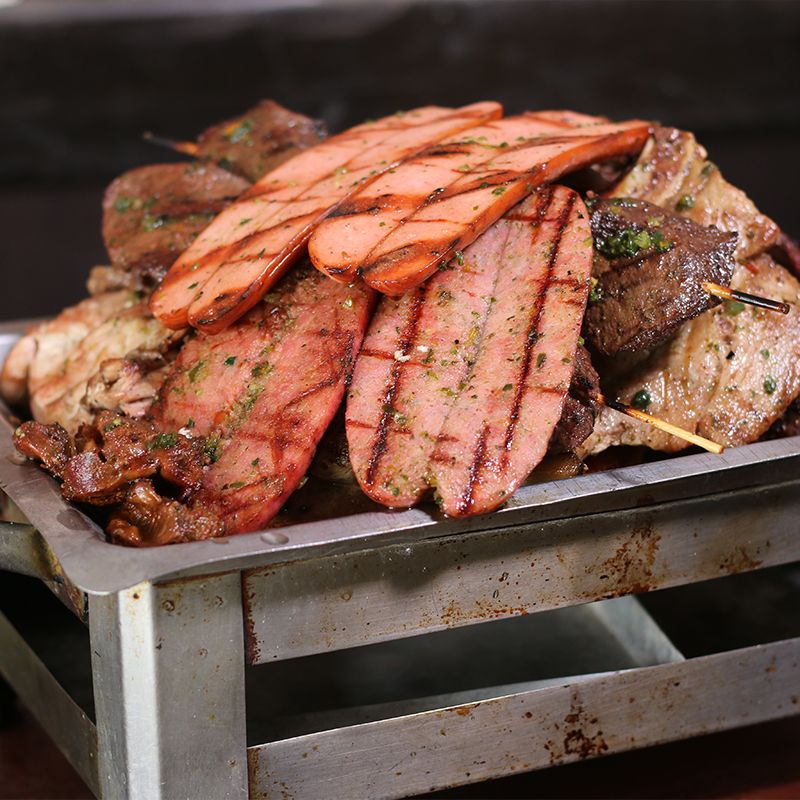 Bife nacional, 1/4 de pollo a la leña, mollejitas y chorizo.