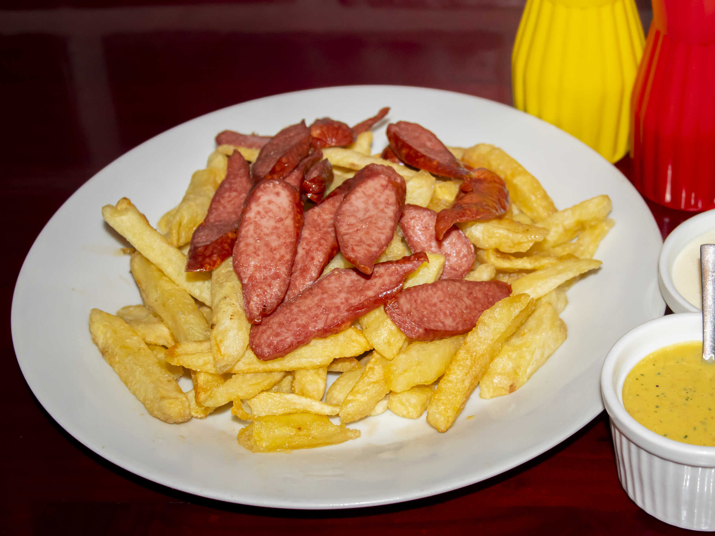 Trozos de salchicha, papas fritas crocantes, ensalada clásica y cremas.