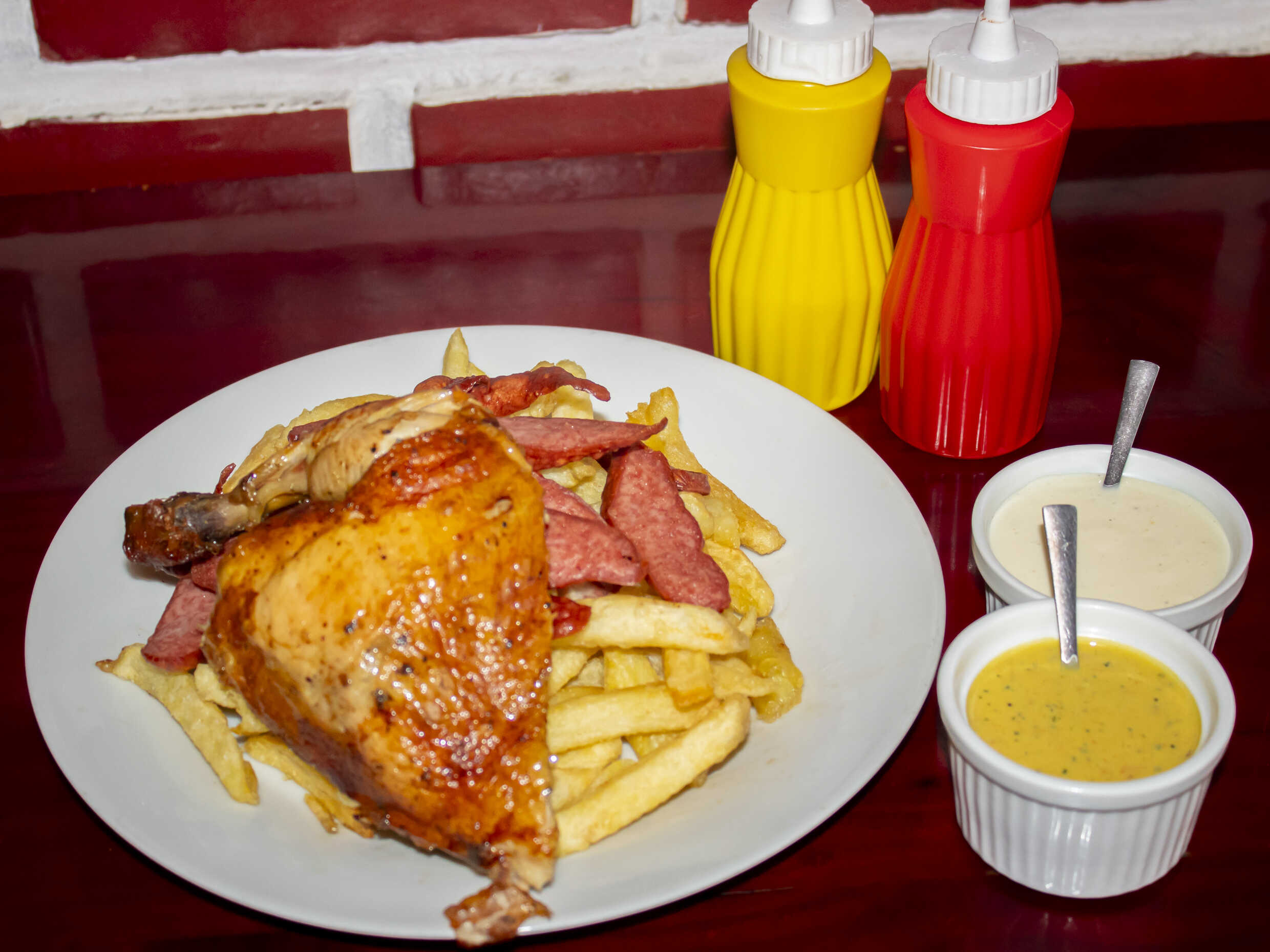 Trozos de salchicha, trozos de pollo a la leña, papas fritas crocantes, ensalada y cremas.