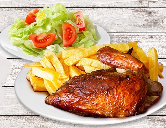 1/4 De pollo a la leña 3 piezas , papas fritas crocantes, ensalada y cremas. 24