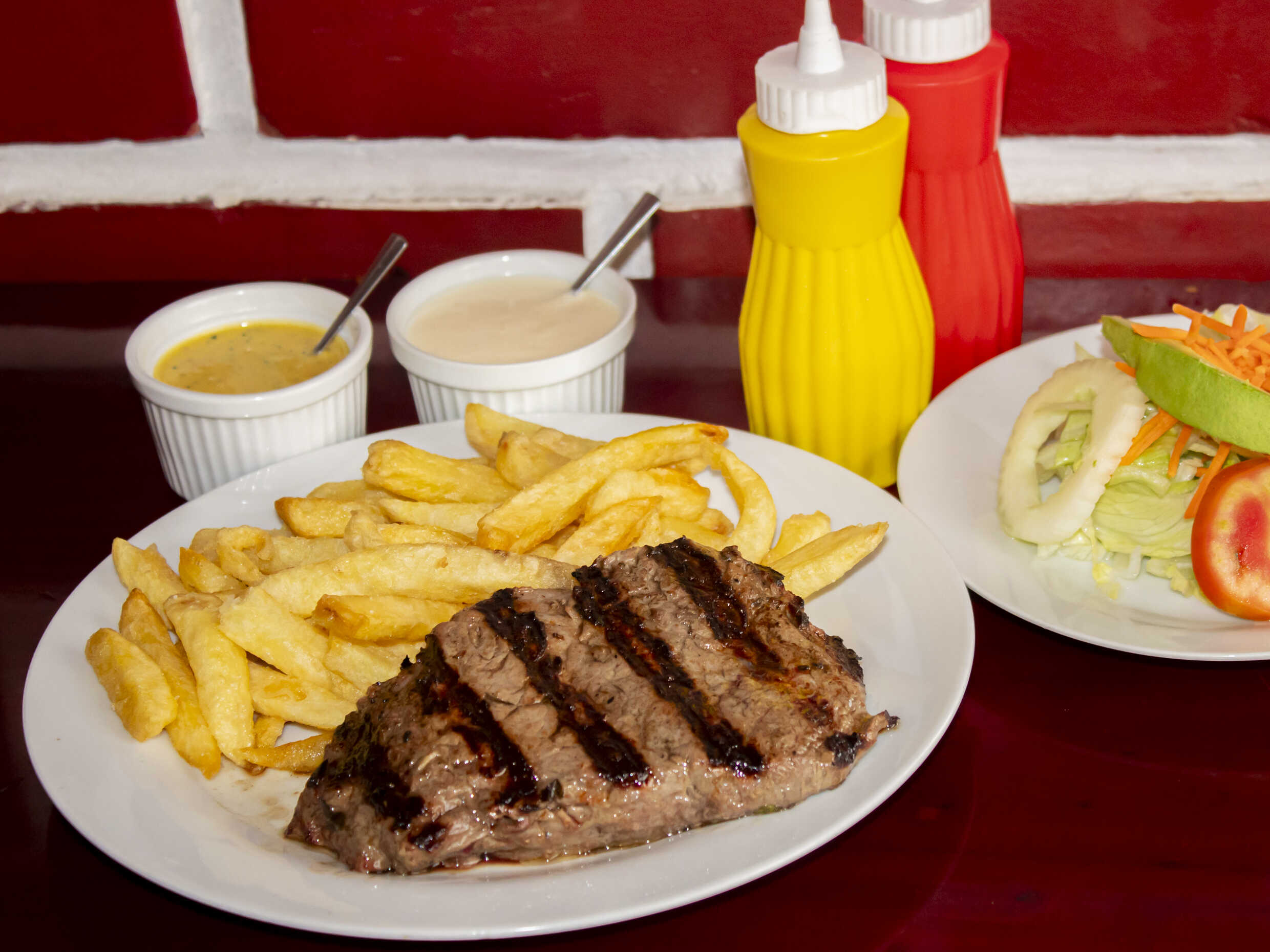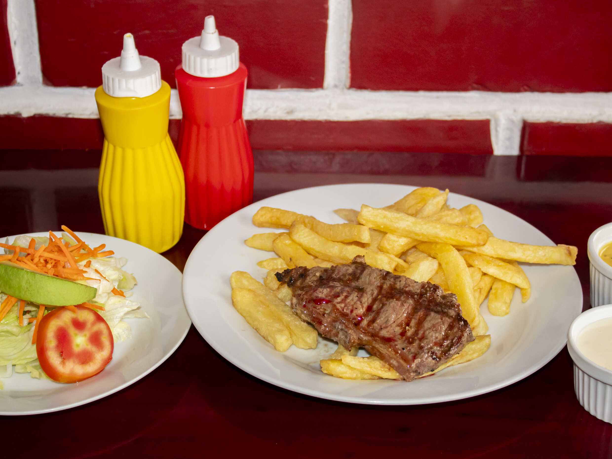 Bife argentino, papas fritas y ensalada clásica.