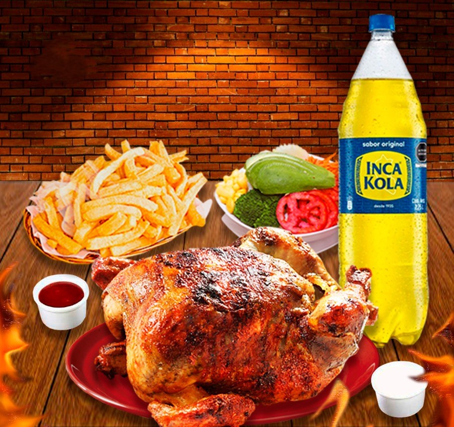 1 Pollo a la leña, papas fritas crocantes, ensalada, cremas e Inca Kola 1.5 L.