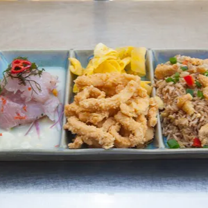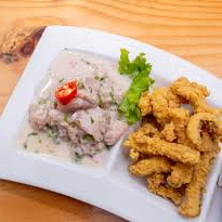 Ceviche de pescado con chicharron de pota y chaufa