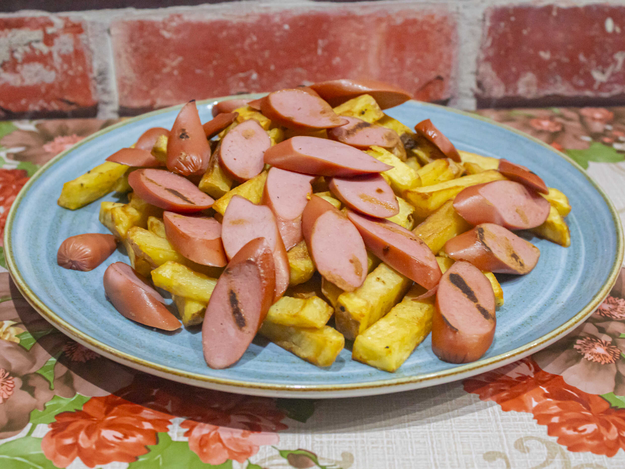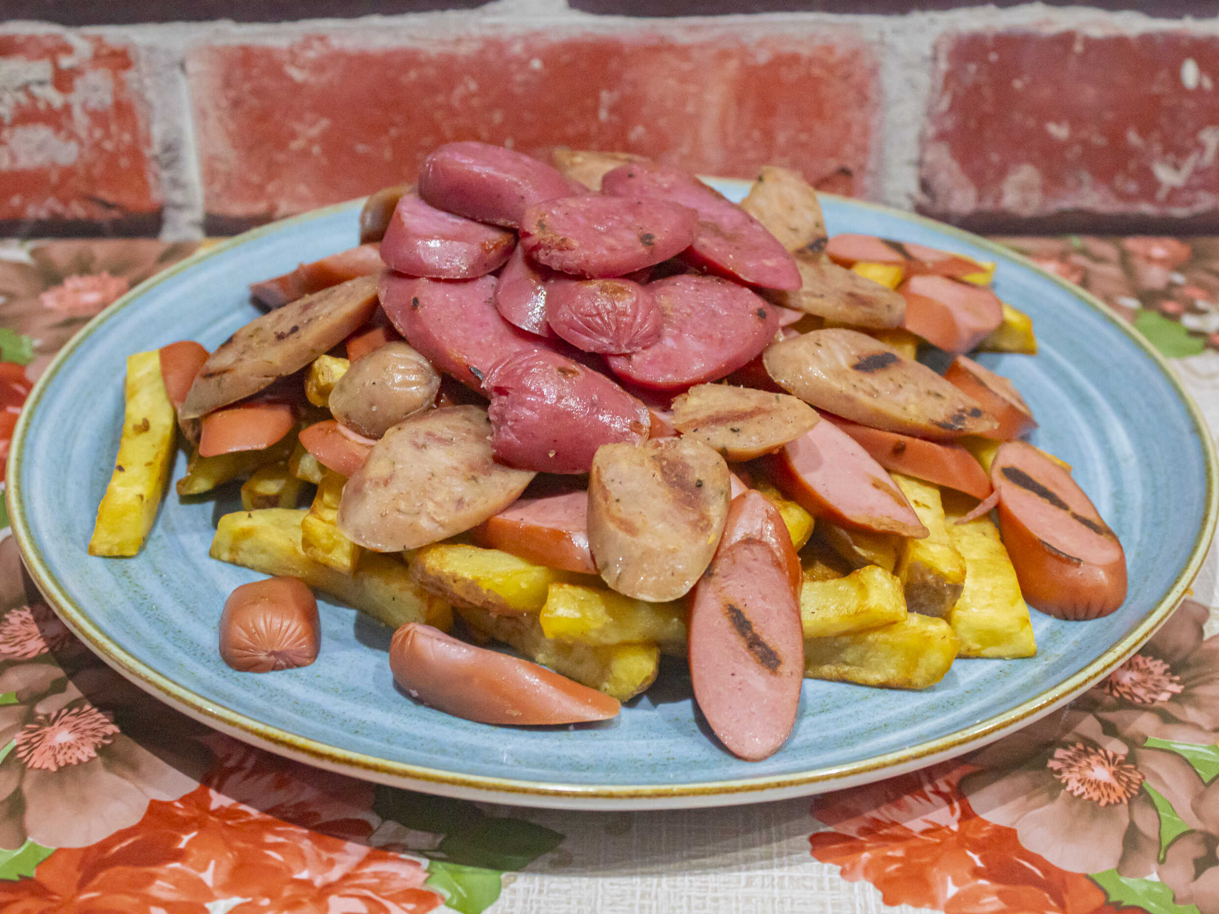 salchicha ahumada, chorizo parrillero, chorizo finas hierbas, papas artesanales fritas y cremas al gusto.