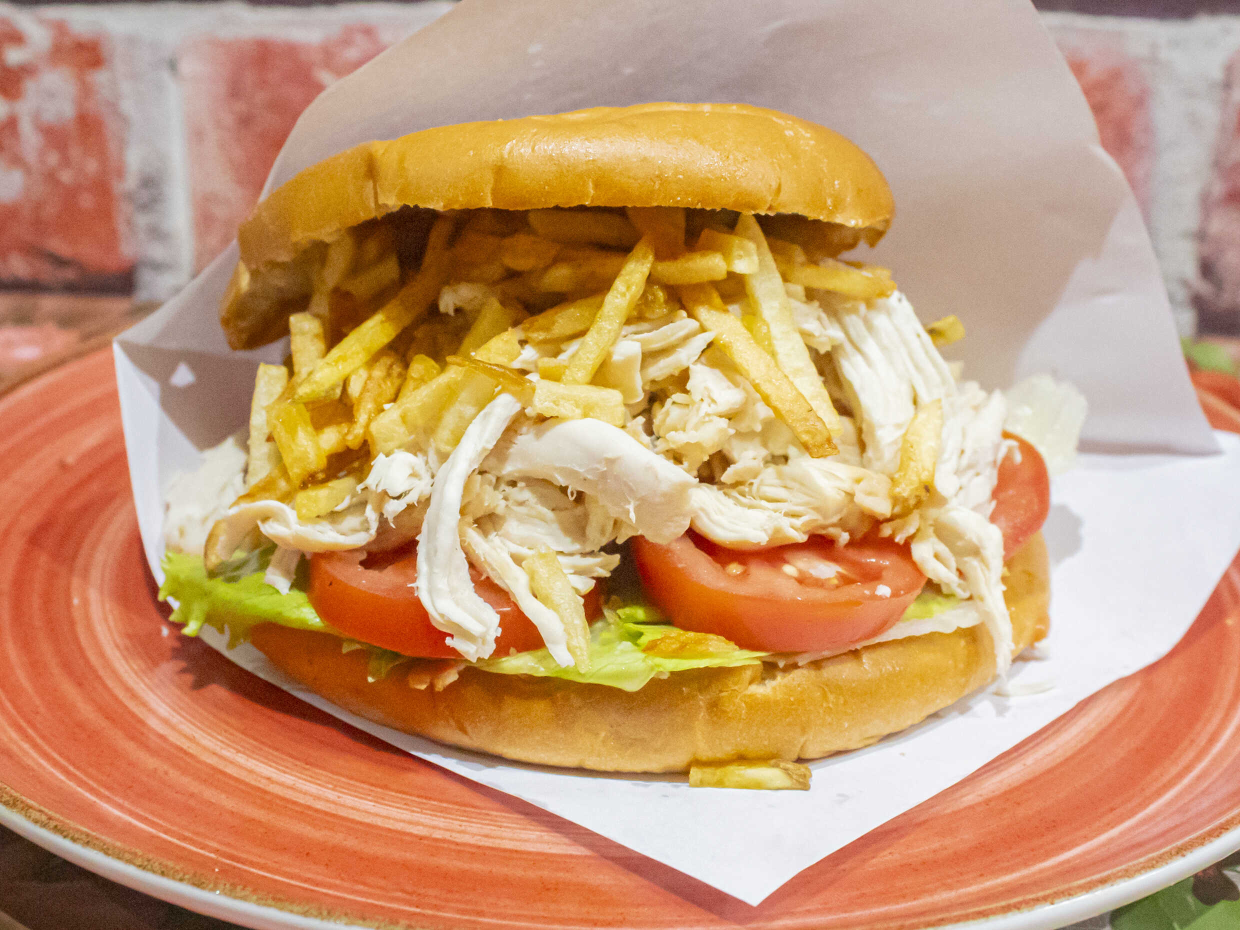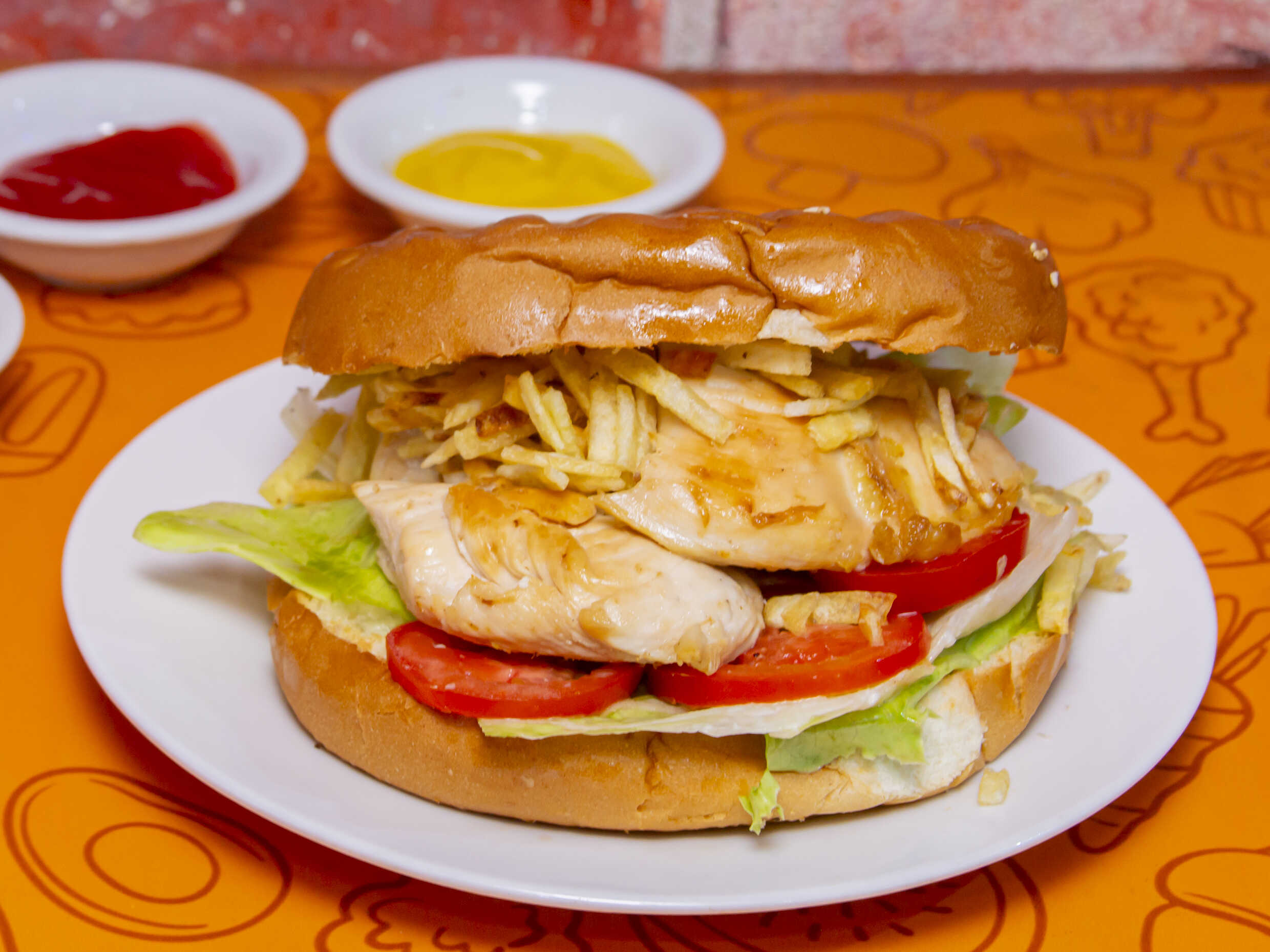 Pan de hamburguesa tostado, filete pollo al grill, lechuga, tomate, papas al hilo y cremas.