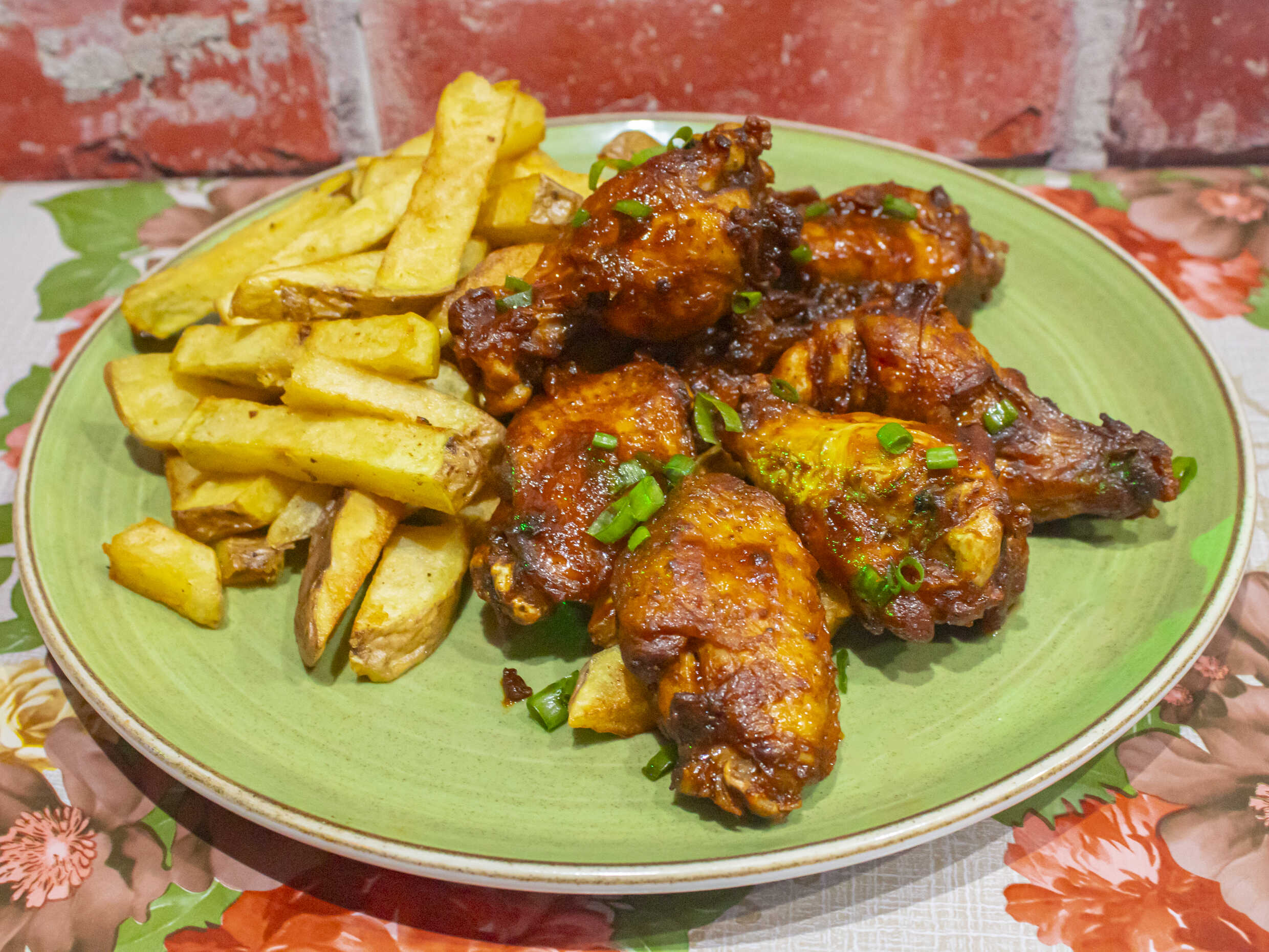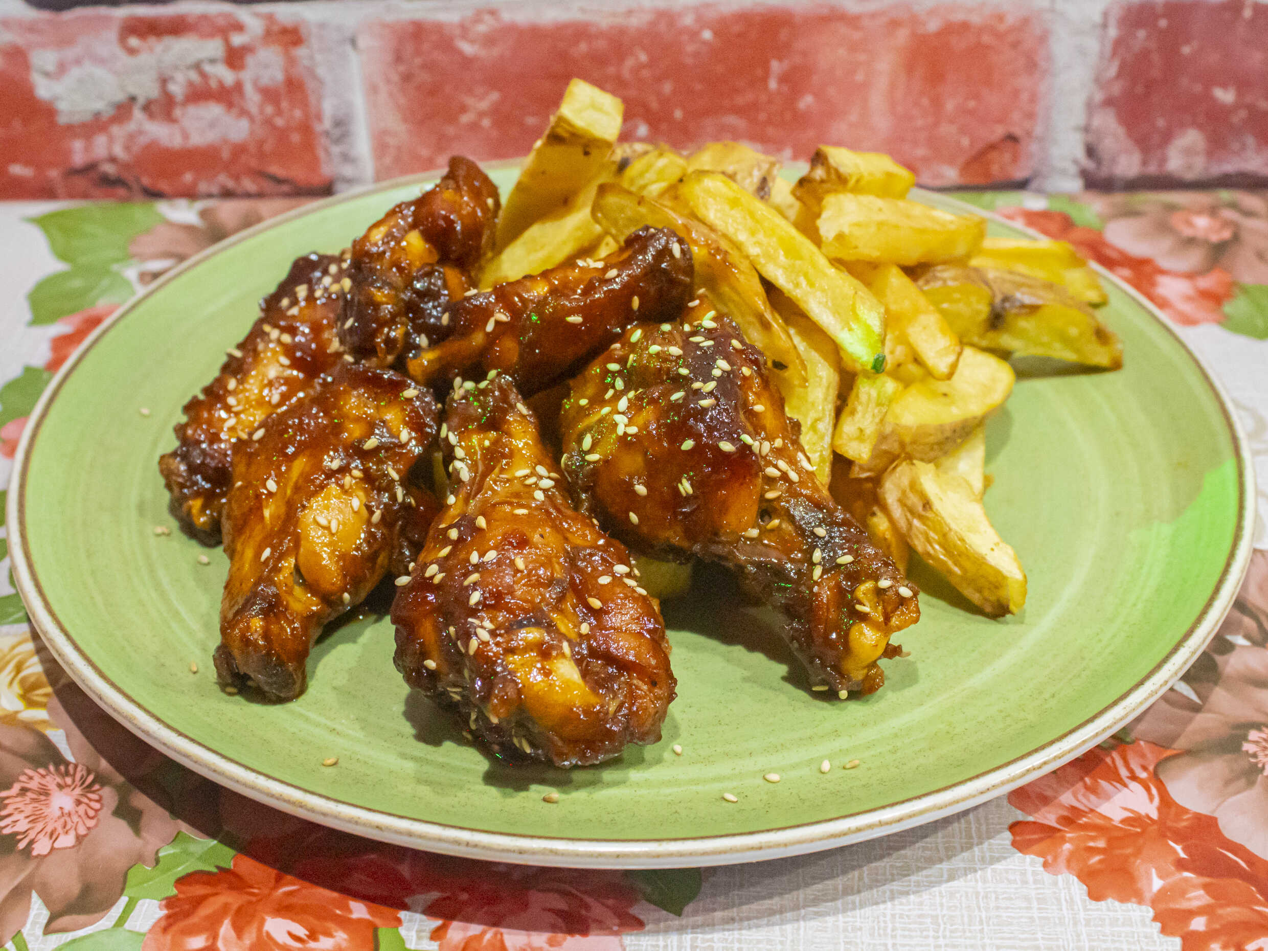 8 piezas de Alitas, BBQ, papas fritas y cremas.