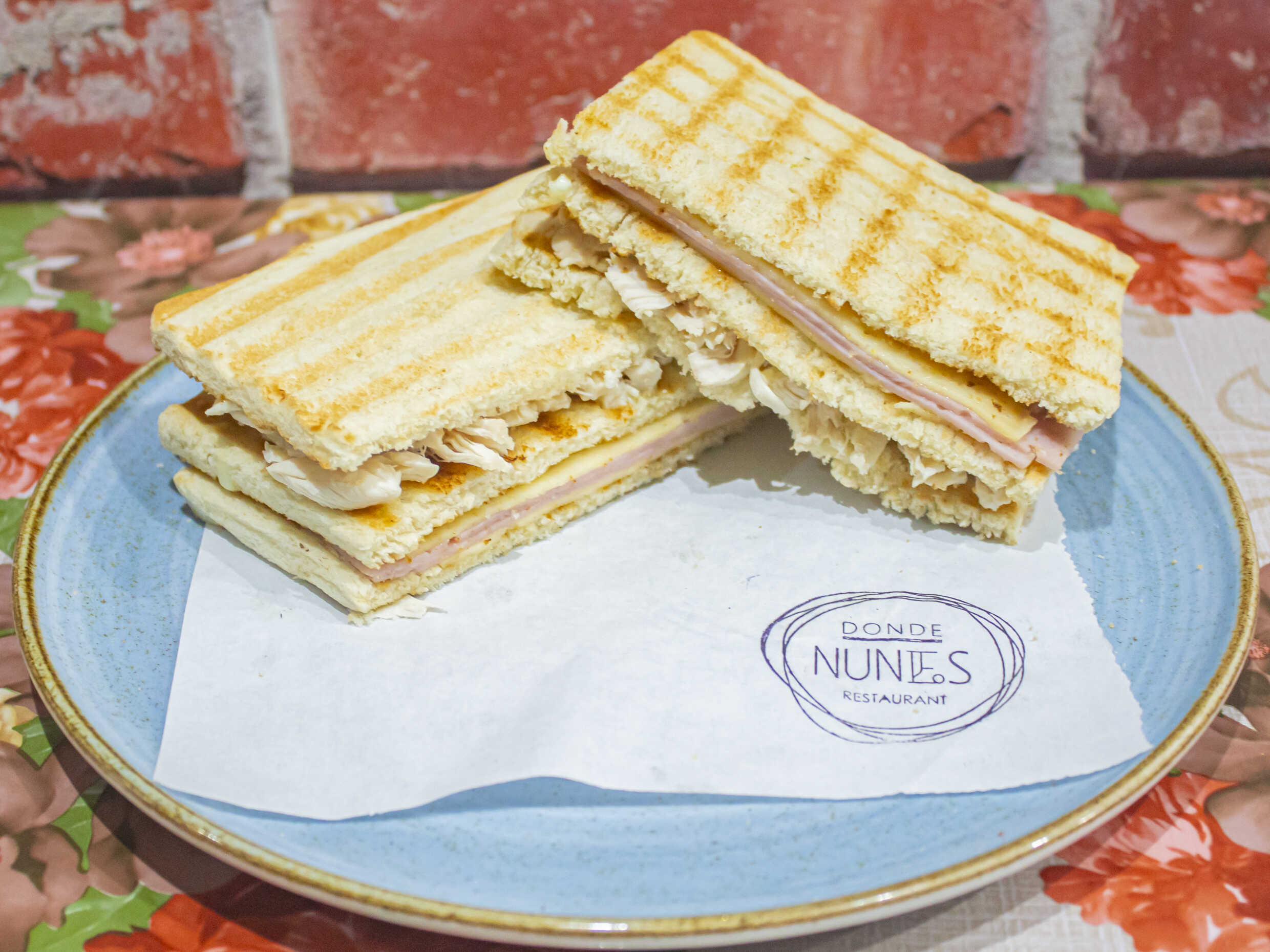 3 Pan molde rellenos de jamón ingles, queso edam y pollo deshilachado con mayonesa. tostado en waflera