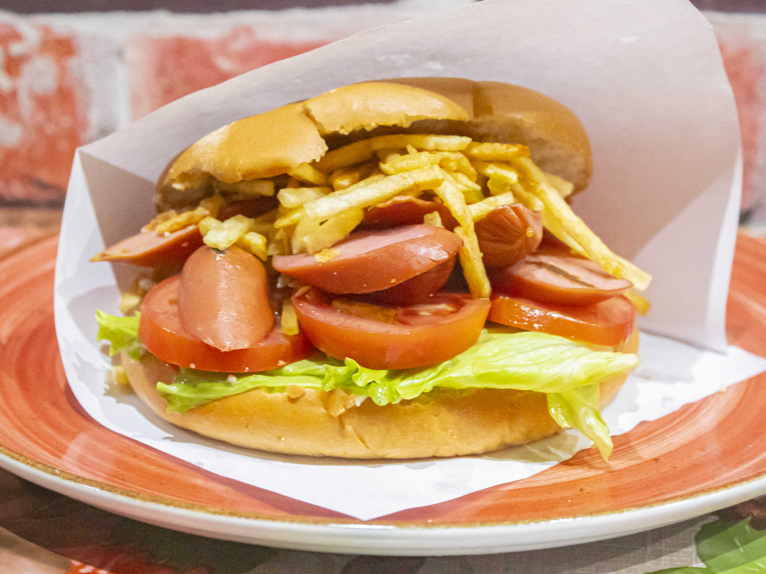 Pan de hamburguesa tostado, lechuga, tomate, chorizo parrillero con papas al hilo y cremas.