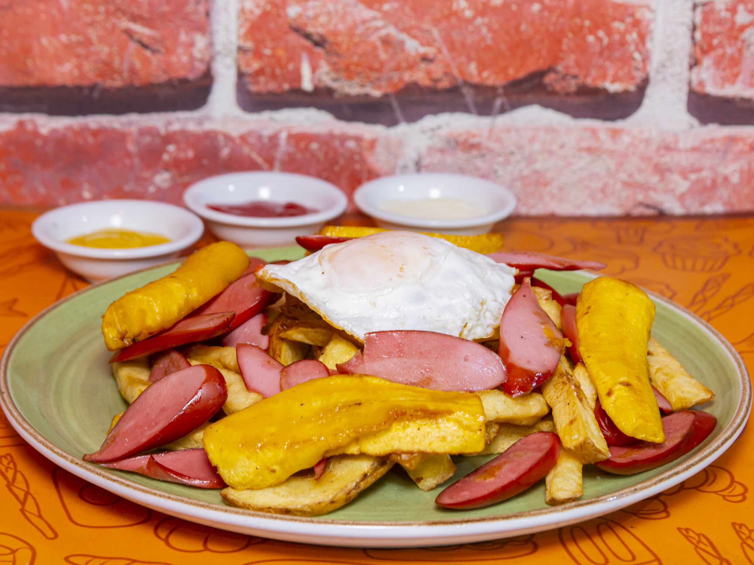 Hot dog, huevo frito, plátano frito, papas fritas y cremas.