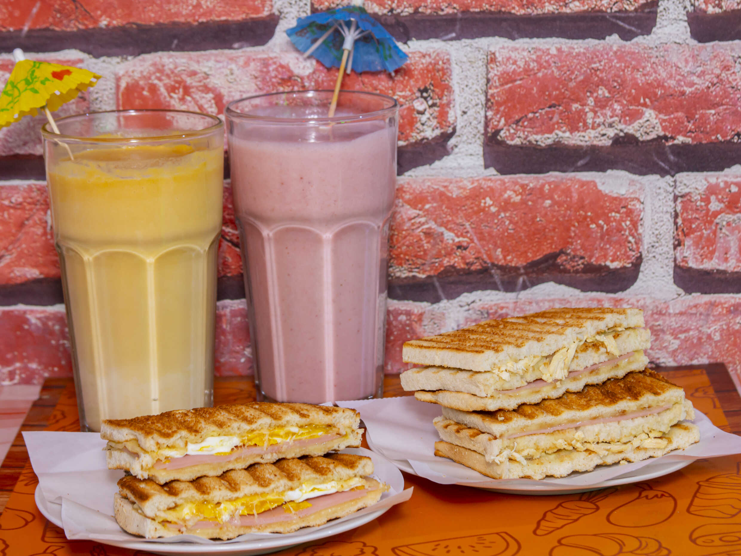Jugo de Lúcuma con Leche*1 + Jugo de Fresa con Leche*1 + Sandwich Triple Caliente*1 + Sandwich Mixto Completo*1