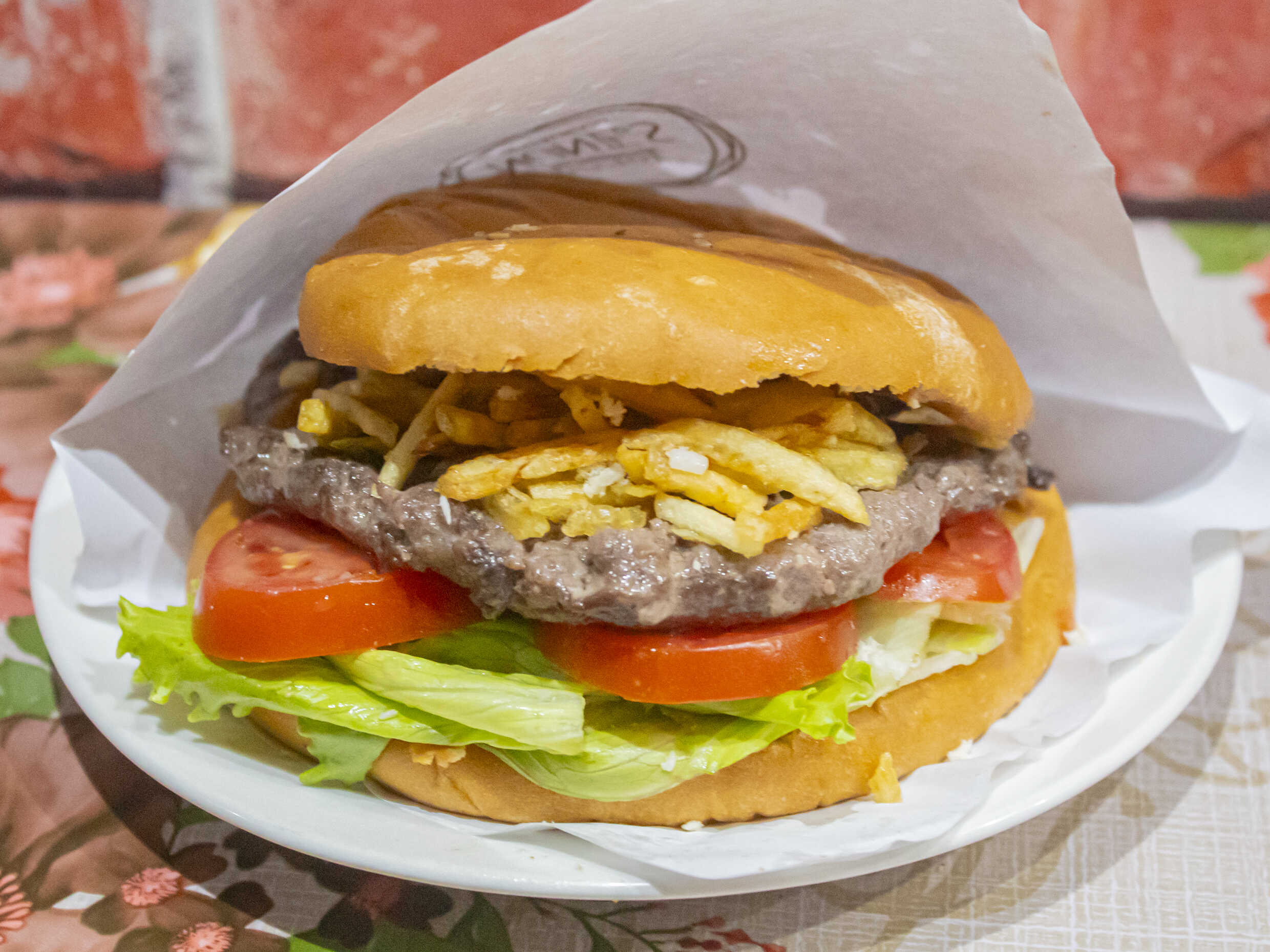 Pan de hamburguesa tostado, lechuga, tomate, carne artesanal, papa al hilo y cremas