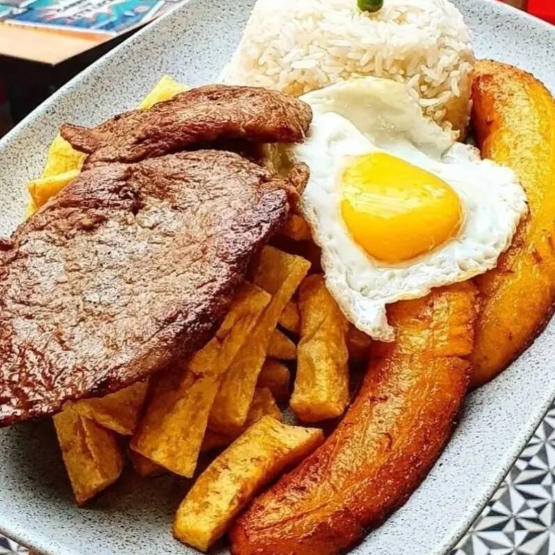 Carne de res, plátano, huevo, papas fritas y ensalada.