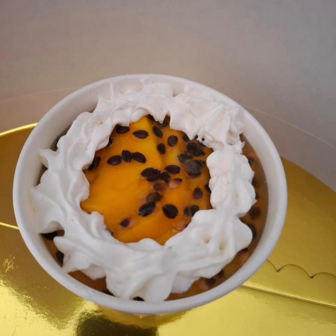 Nuestra galleta de base y nuestra crema de pulpa de mango y maracuyá decorado con mango picado y salsa de maracuyá.
