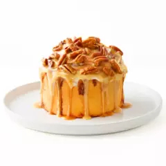Cinnamon roll, masa suave enrollada con azúcar y canela, bañada con un cremoso glaseado y coronada con trozos de pecanas.