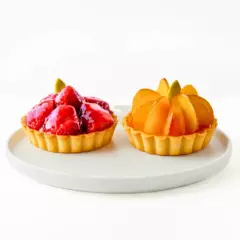 Mini tarta con base de masa crujiente, rellena de crema y frutas, fresa o durazno.