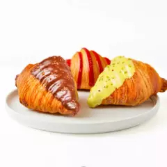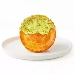 Rollo de masa hojaldré con relleno cremoso de pistacho, bañado con chocolate y trozos de pistacho.