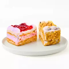 Capas de hojaldre con crema pastelera y frutas frescas, fresa y durazno.