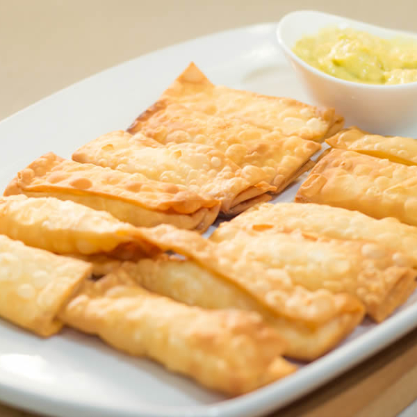 8 deliciosos tequeños anita empanizados, rellenos con jamón y queso y acompañados con guacamole.