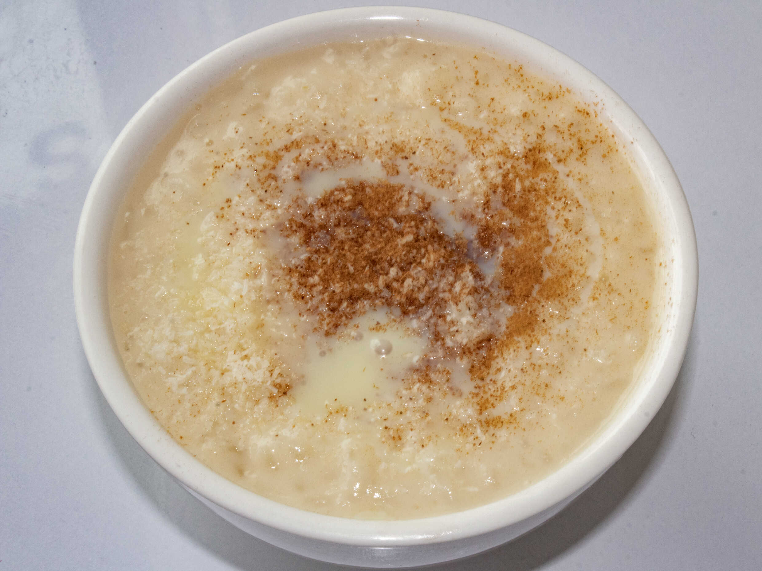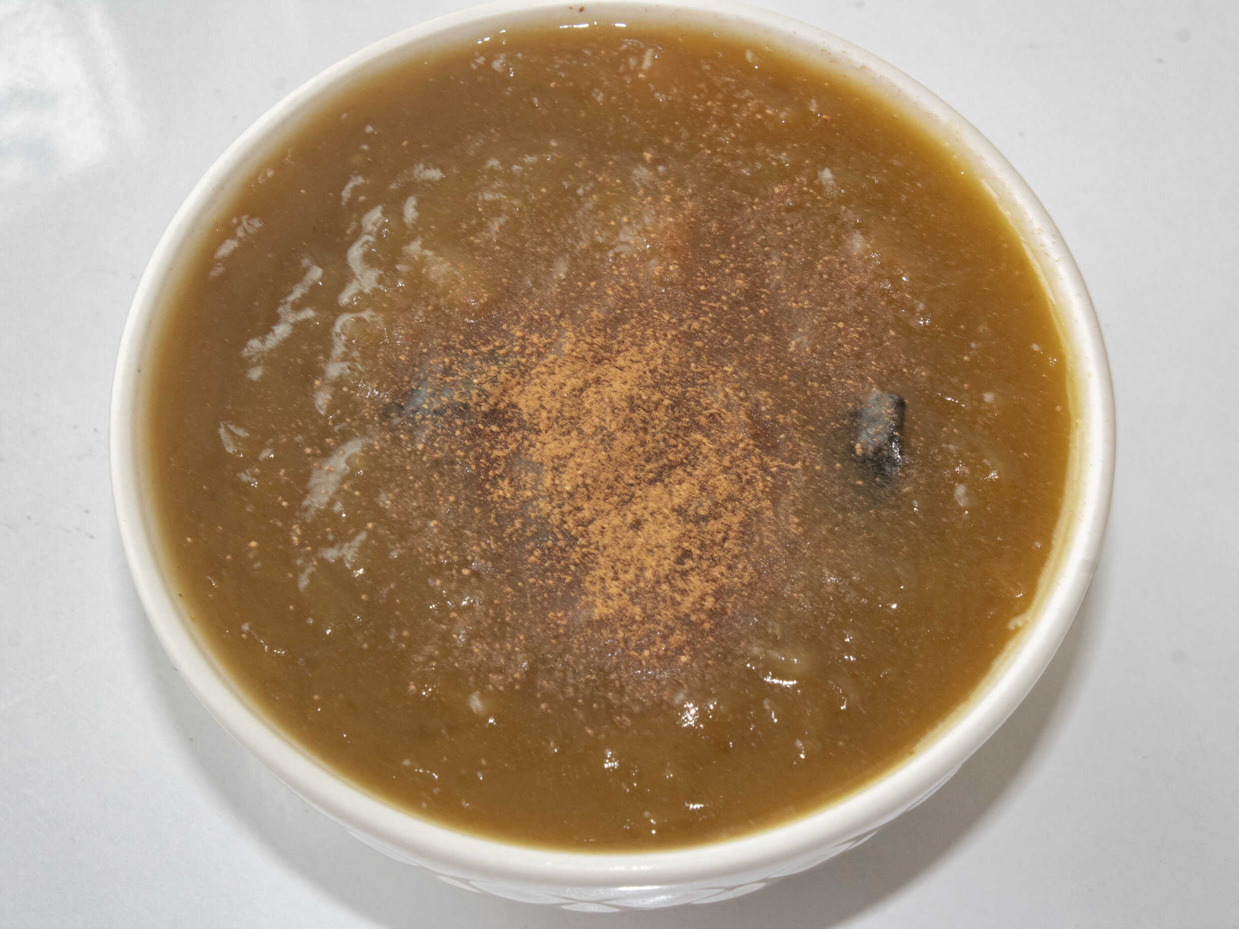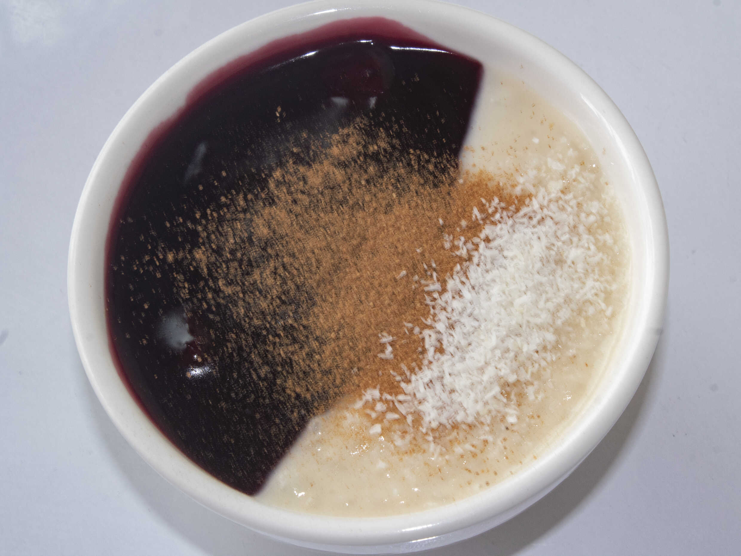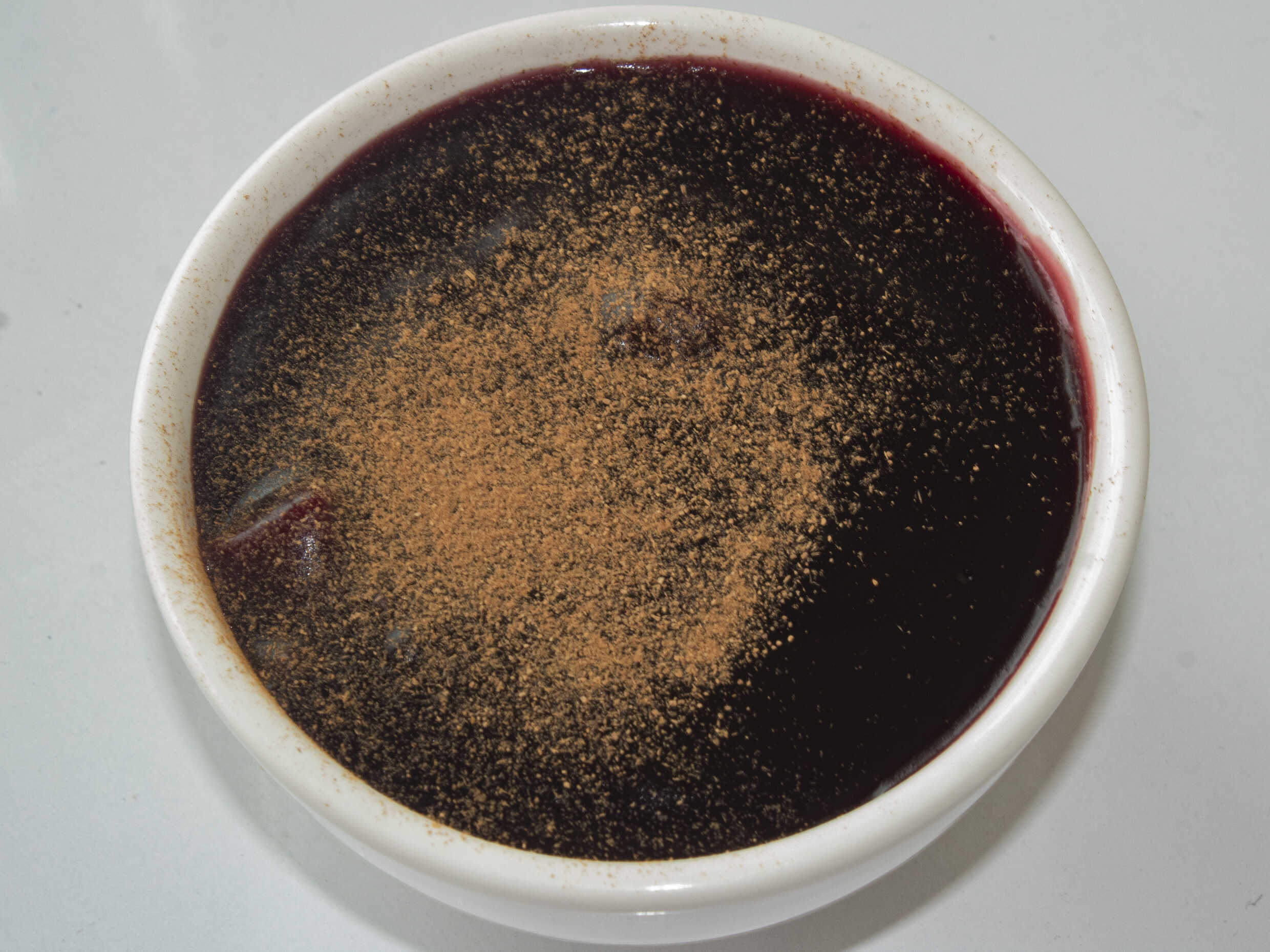 Mazamorra de fécula de maíz morado con canela y clavo tradicional.