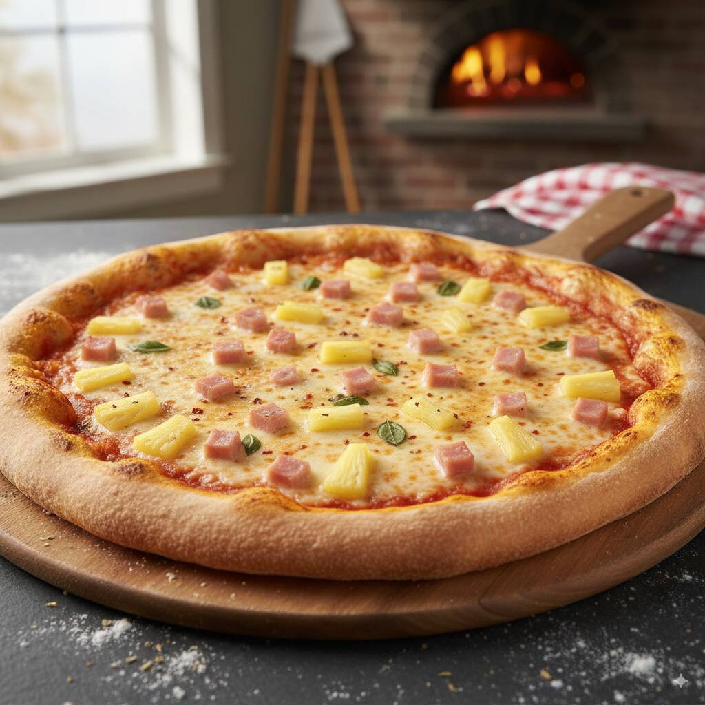 Masa Artesanal, Salsa de Tomate, Piña, Jamón, Trozos de Piña