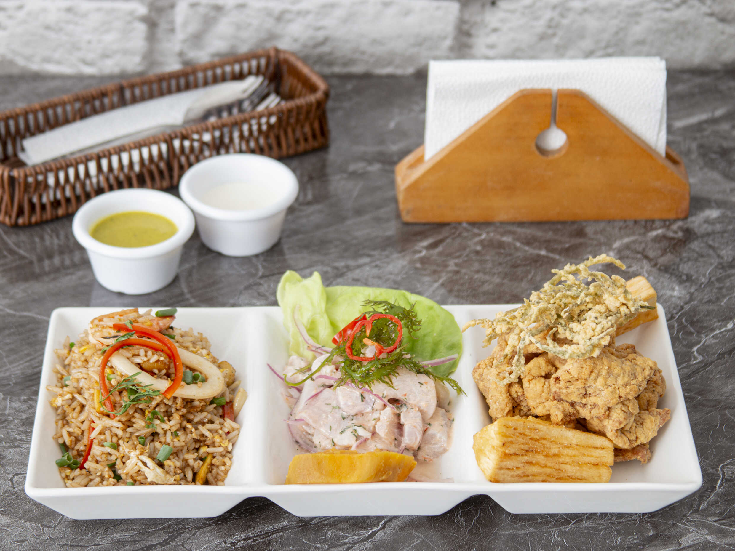 Ceviche de pescado, chicharrón de pota y chaufa de mariscos.