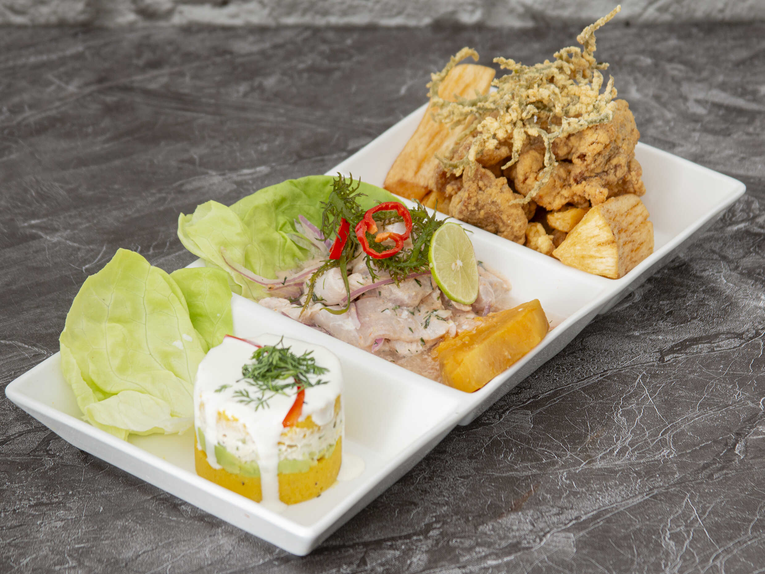 Ceviche de pescado, chicharrón de pota y causa.