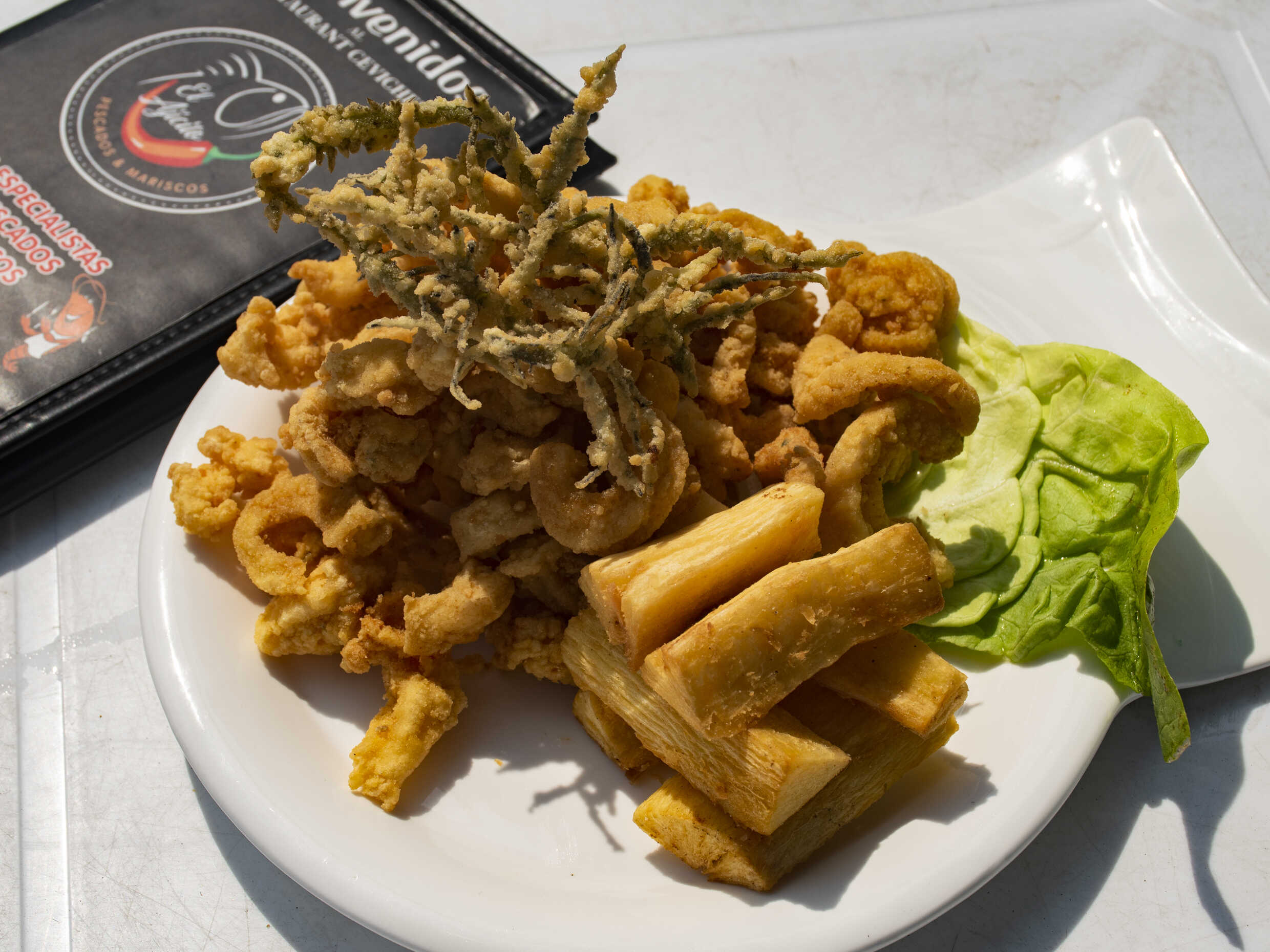 Mixtura de mariscos crocantes, acompañados de yucas doradas, sarza criolla y nuestras salsas de la casa.