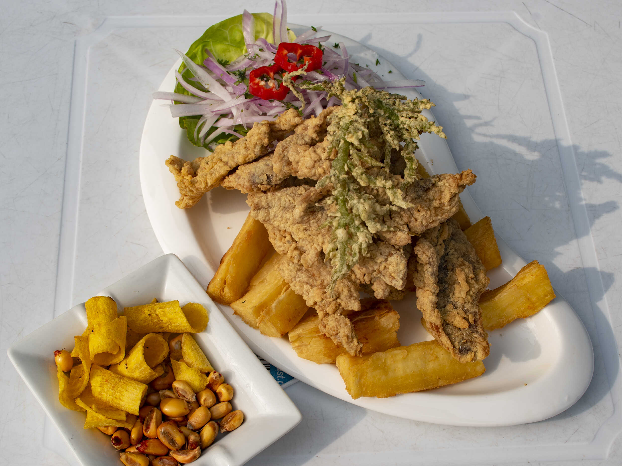 Trucha frita, acompañado de yucas doradas, porción de arroz y sarza criolla.