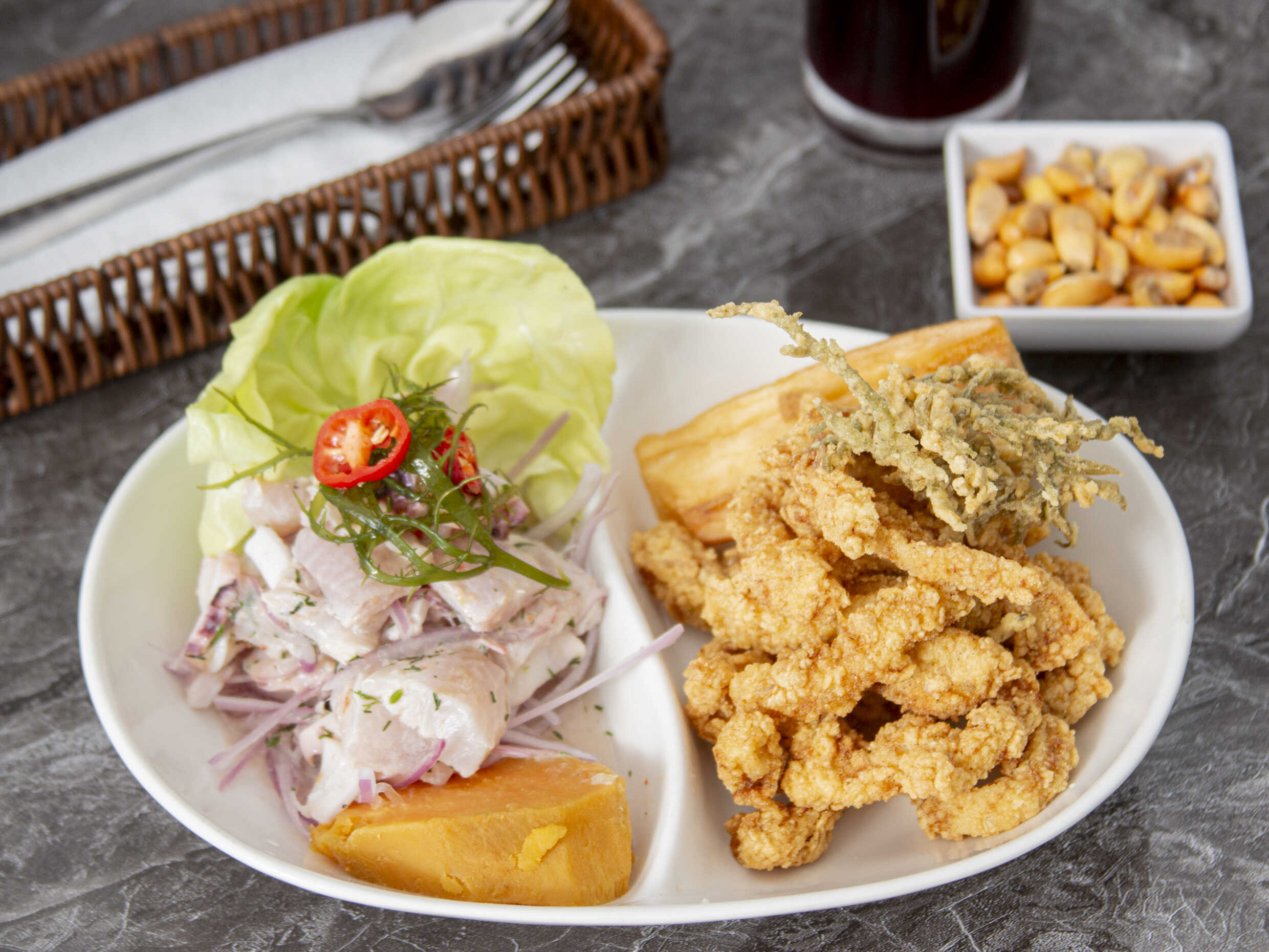 Deliciosa pota en tiras crocantes, acompañado de camote en rodajas, choclo desgranado, canchita serrana y sarza criolla.