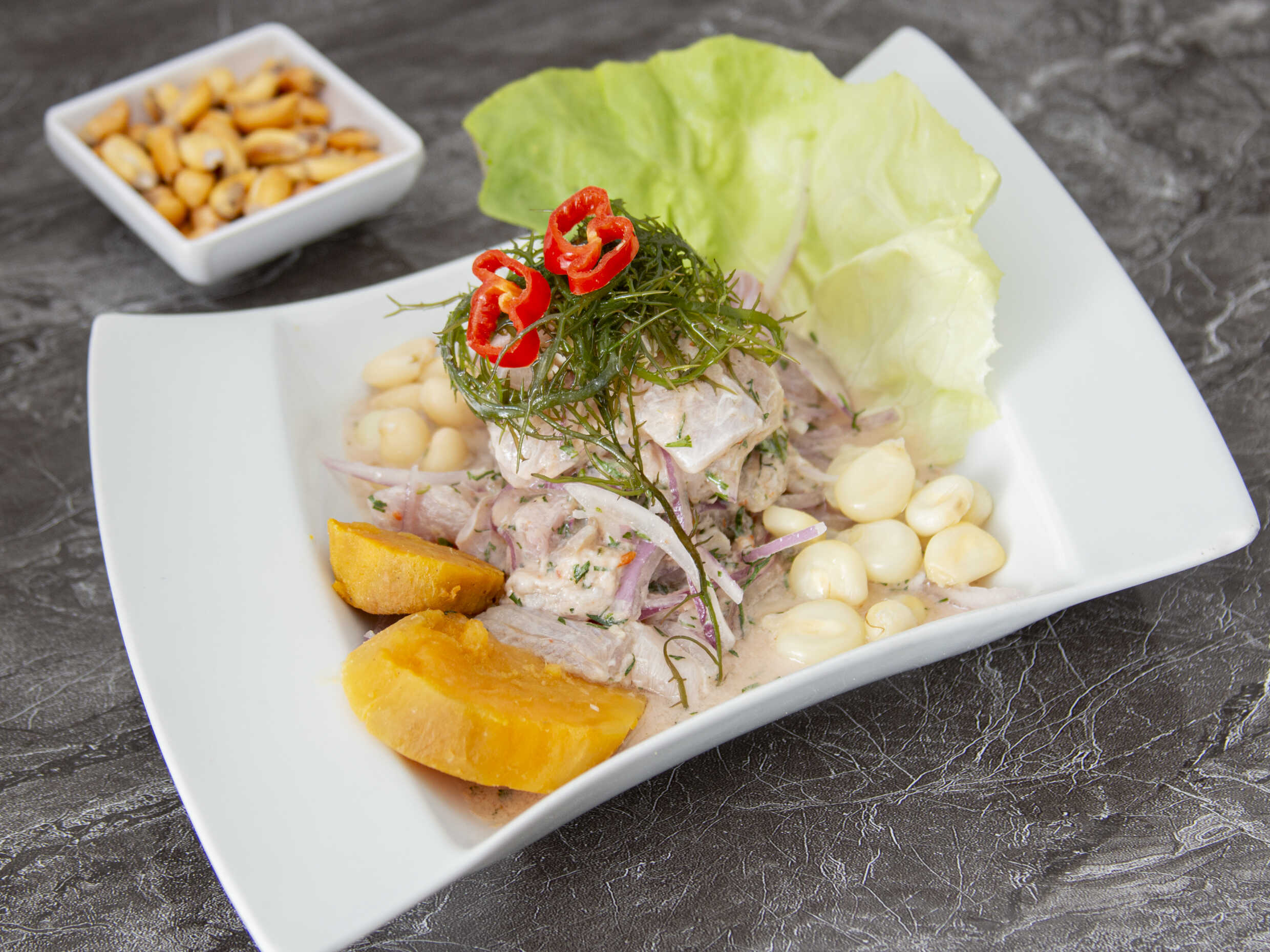 Nuestro rico ceviche de cabrilla, marinado al estilo carretillero, acompañado de camote, lechuga, choclo desgranado y canchita serrana.