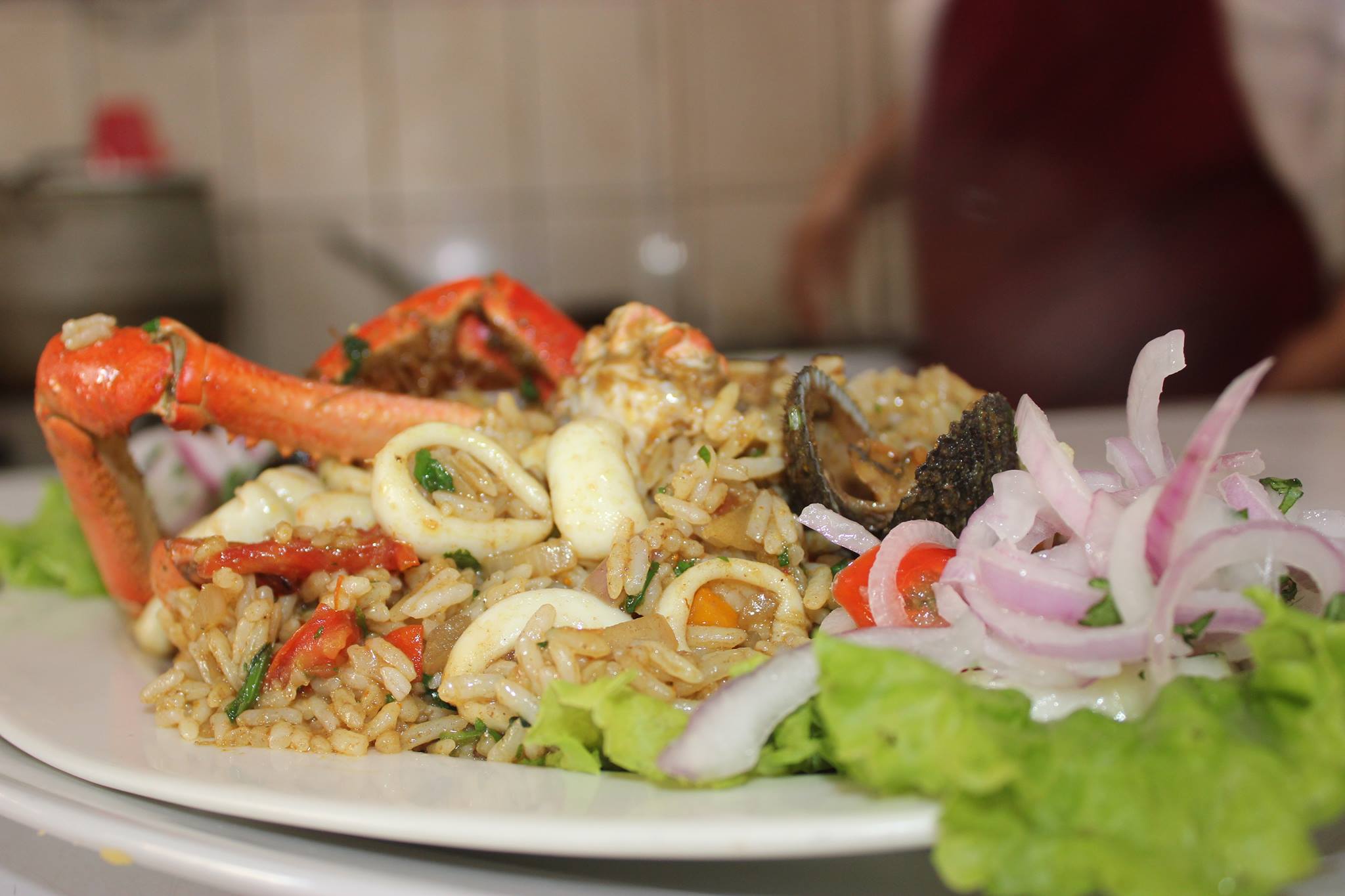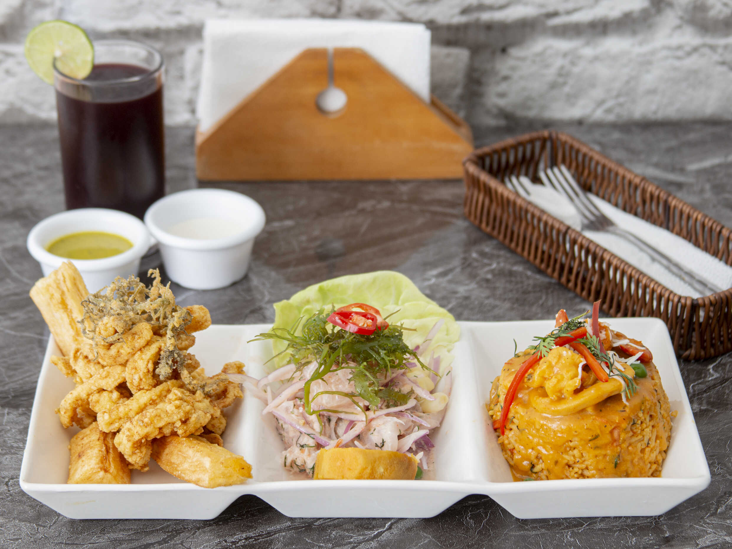Ceviche de pescado, chicharrón de pota y arroz con mariscos.