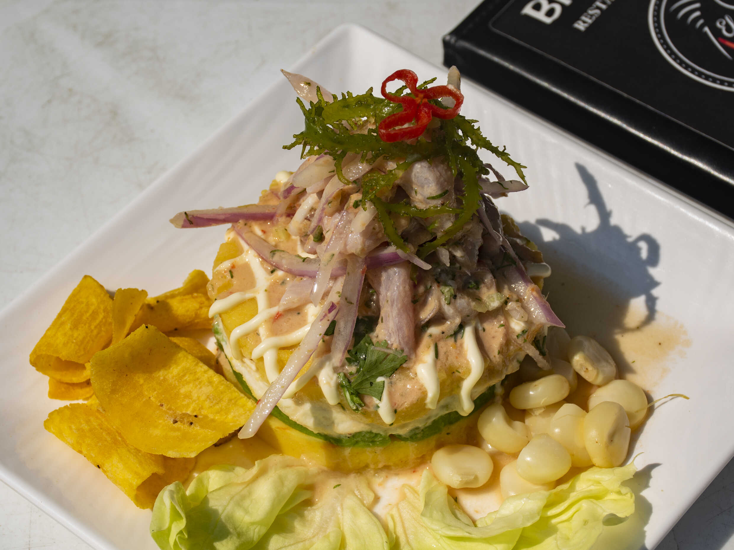 Causa de pollo con ceviche de pescado.