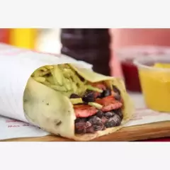 Tortilla de maíz, frijol negro y suprema de pollo.