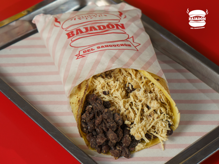Tortilla de maíz, frijol negro, pollo deshilachado y chorizo.