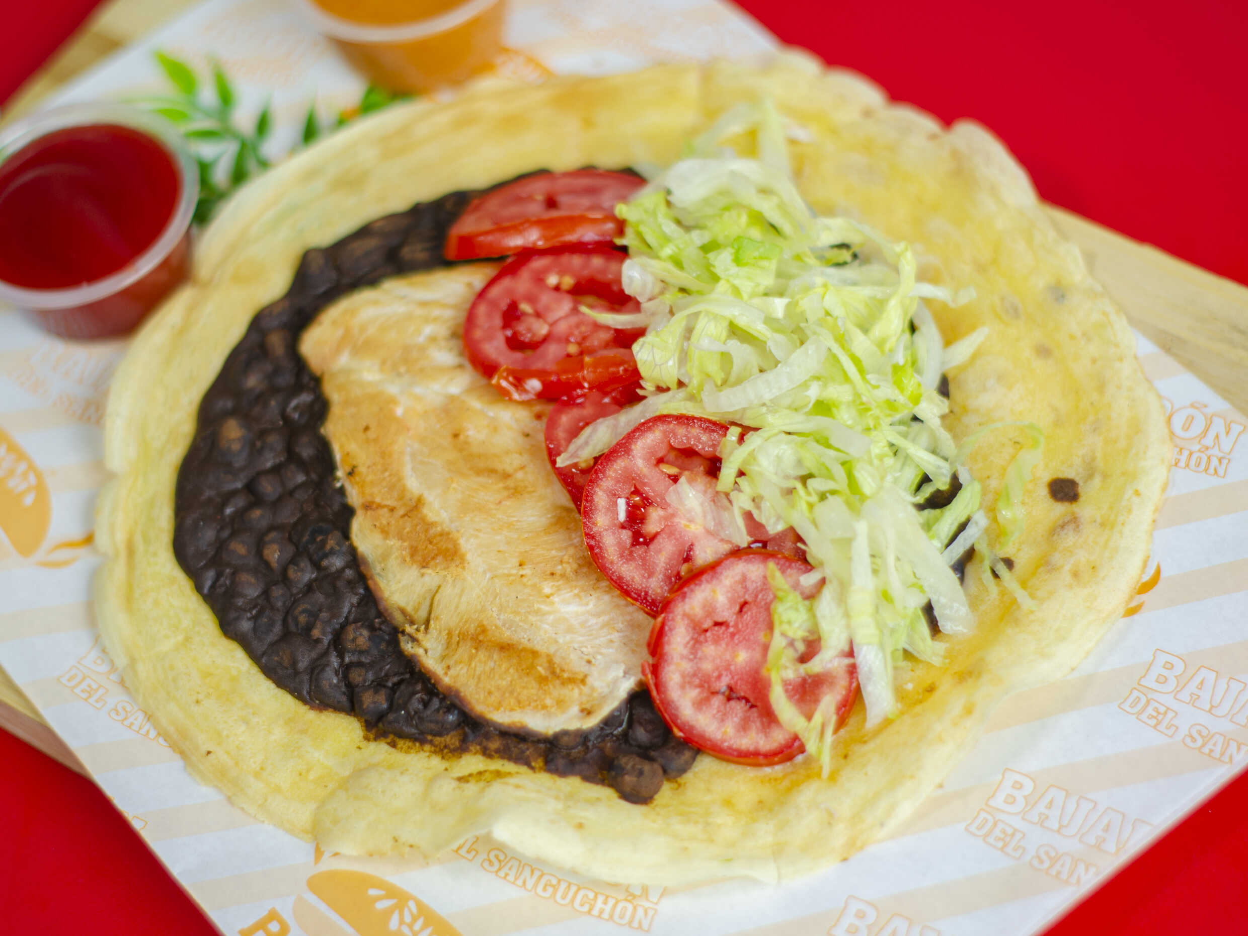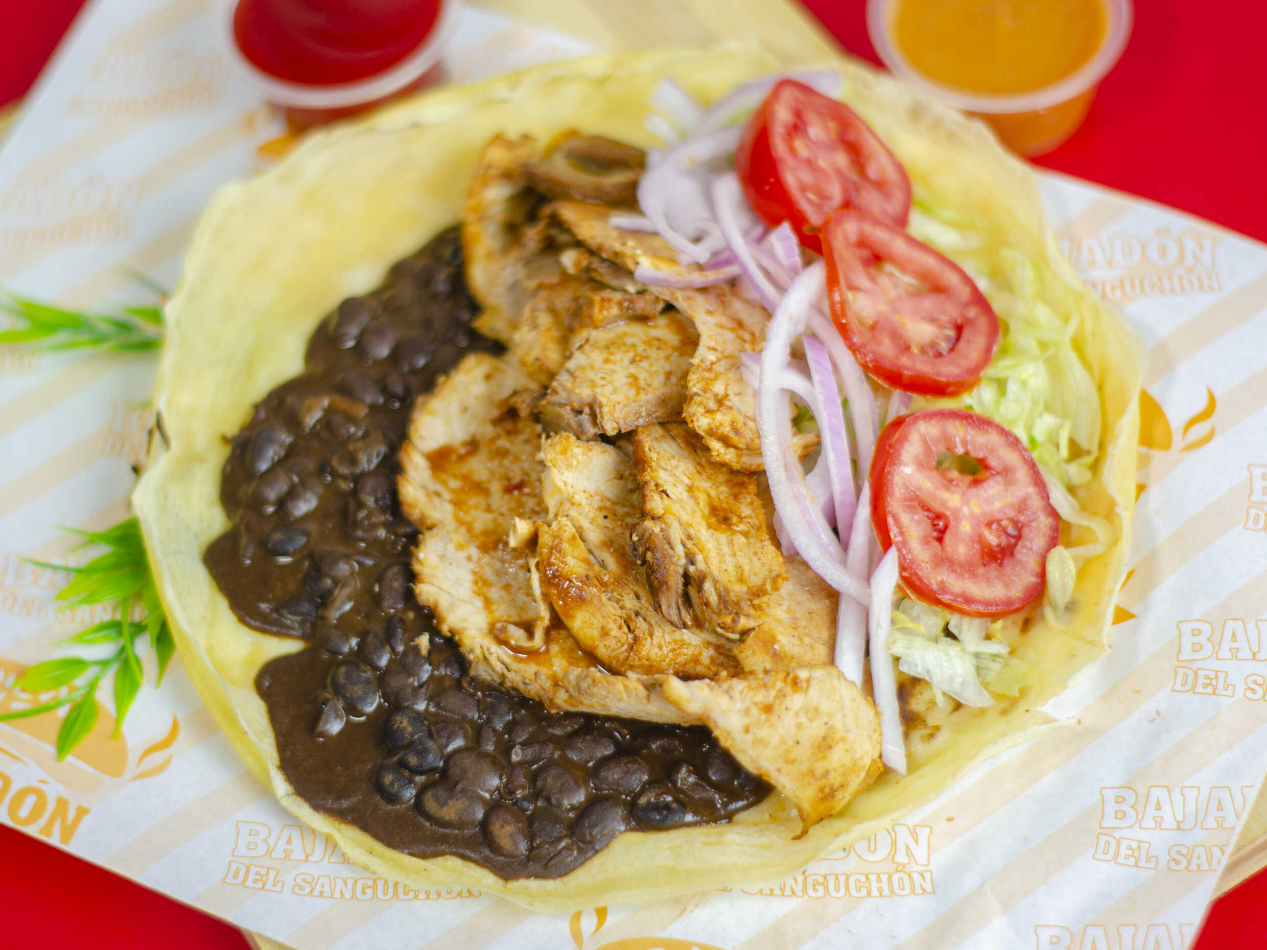 Tortilla de maíz, frijol negro, pollo deshilachado, chorizo y lechón.
