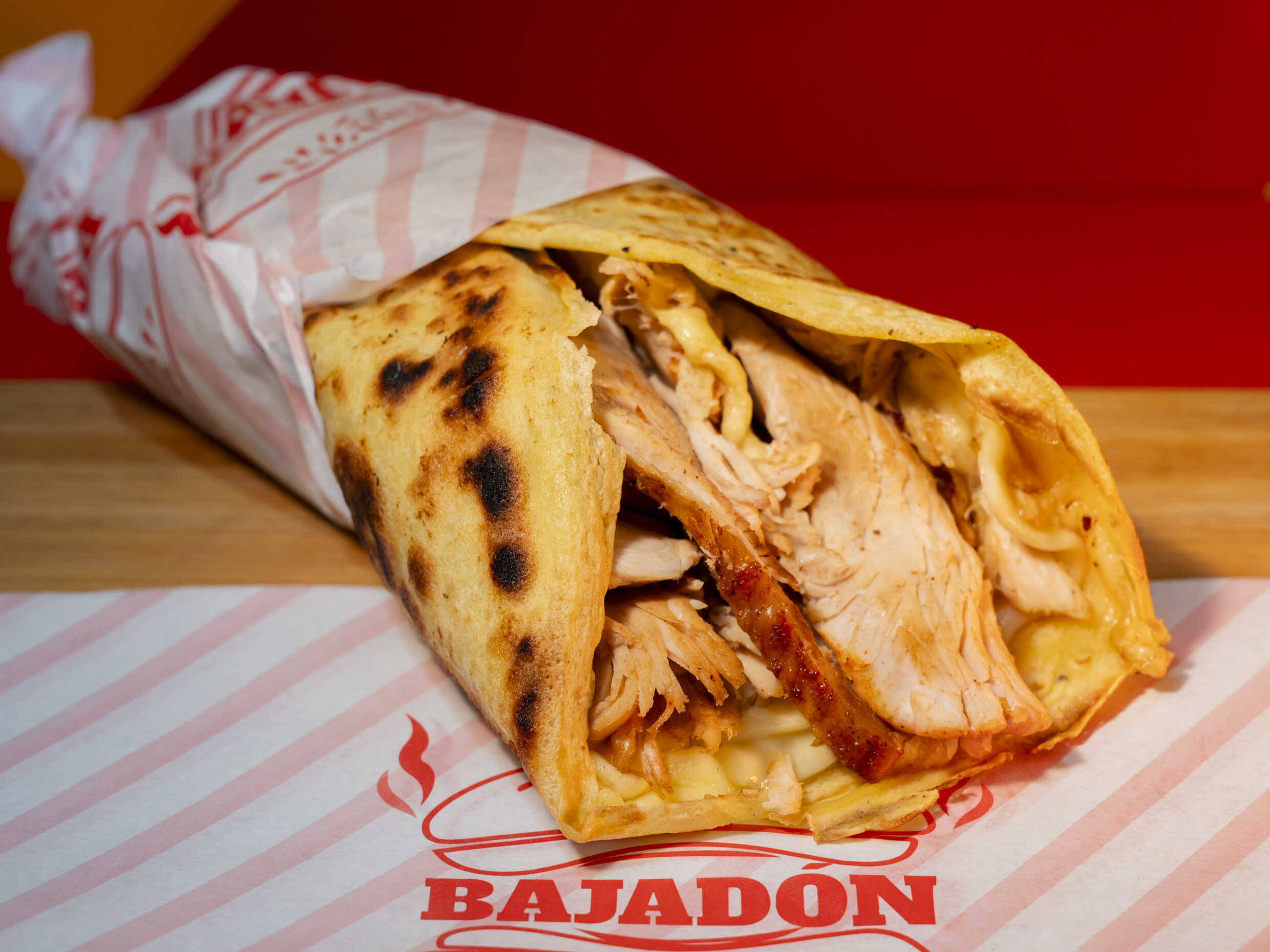 Tortilla de maíz, 3 quesos y suprema de pollo.