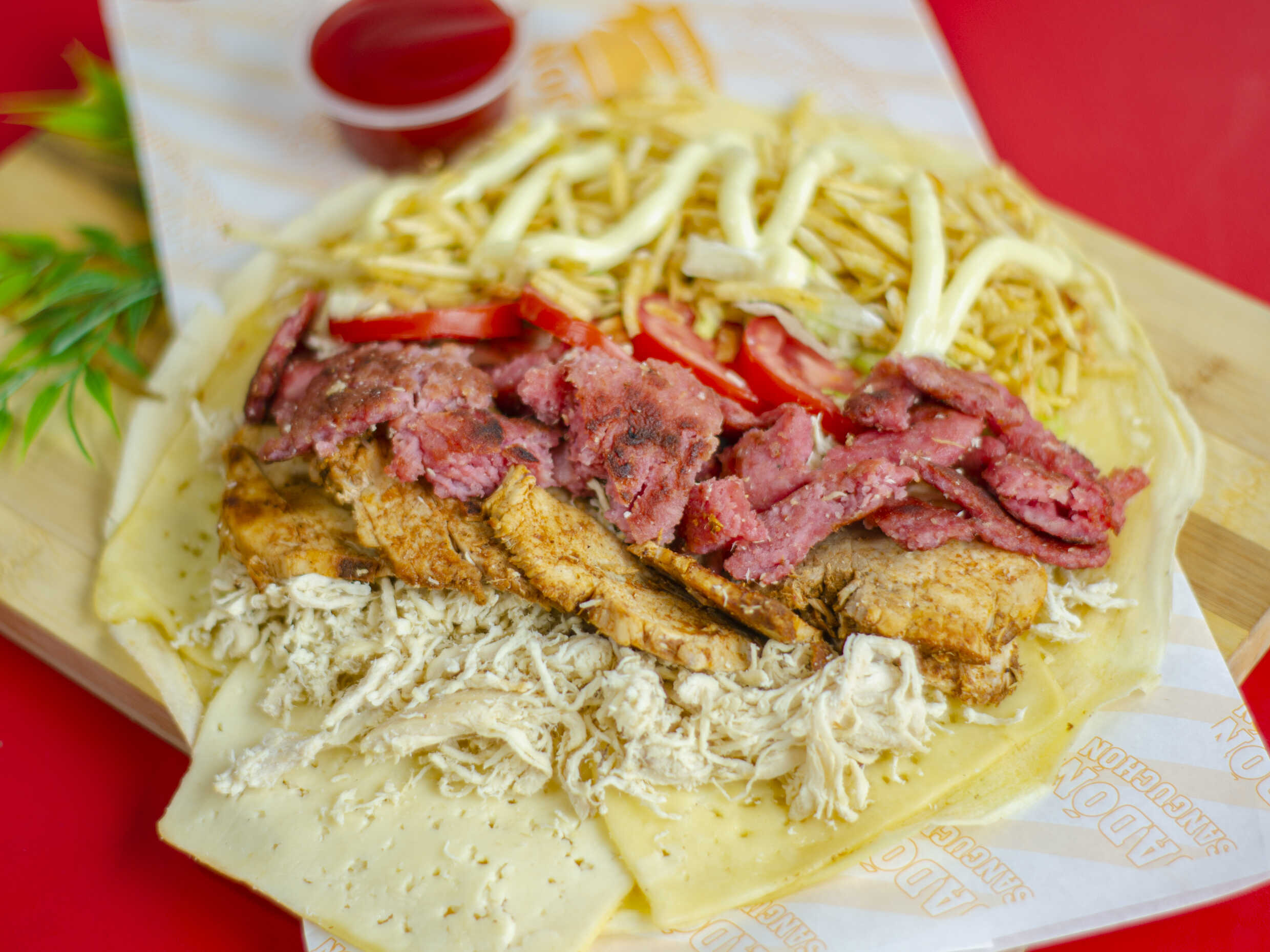 Tortilla de maíz, 3 quesos, pollo deshilachado, chorizo y lechón.