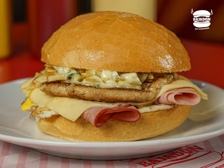 Pan, hamburguesa de carne, 2 jamones y 4 tocinos.