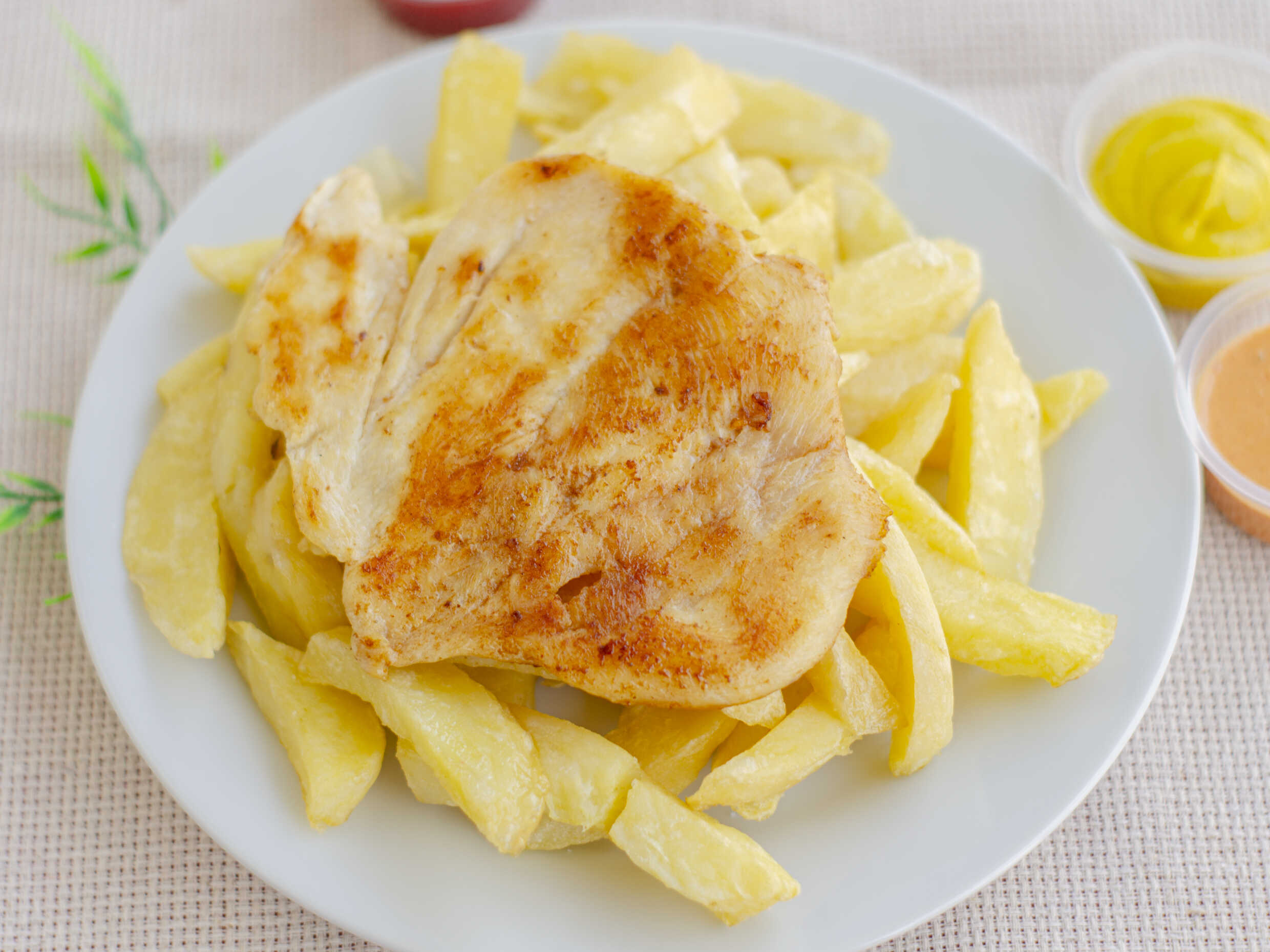 Pan, filete de pollo, 4 tocinos y 1 huevo.