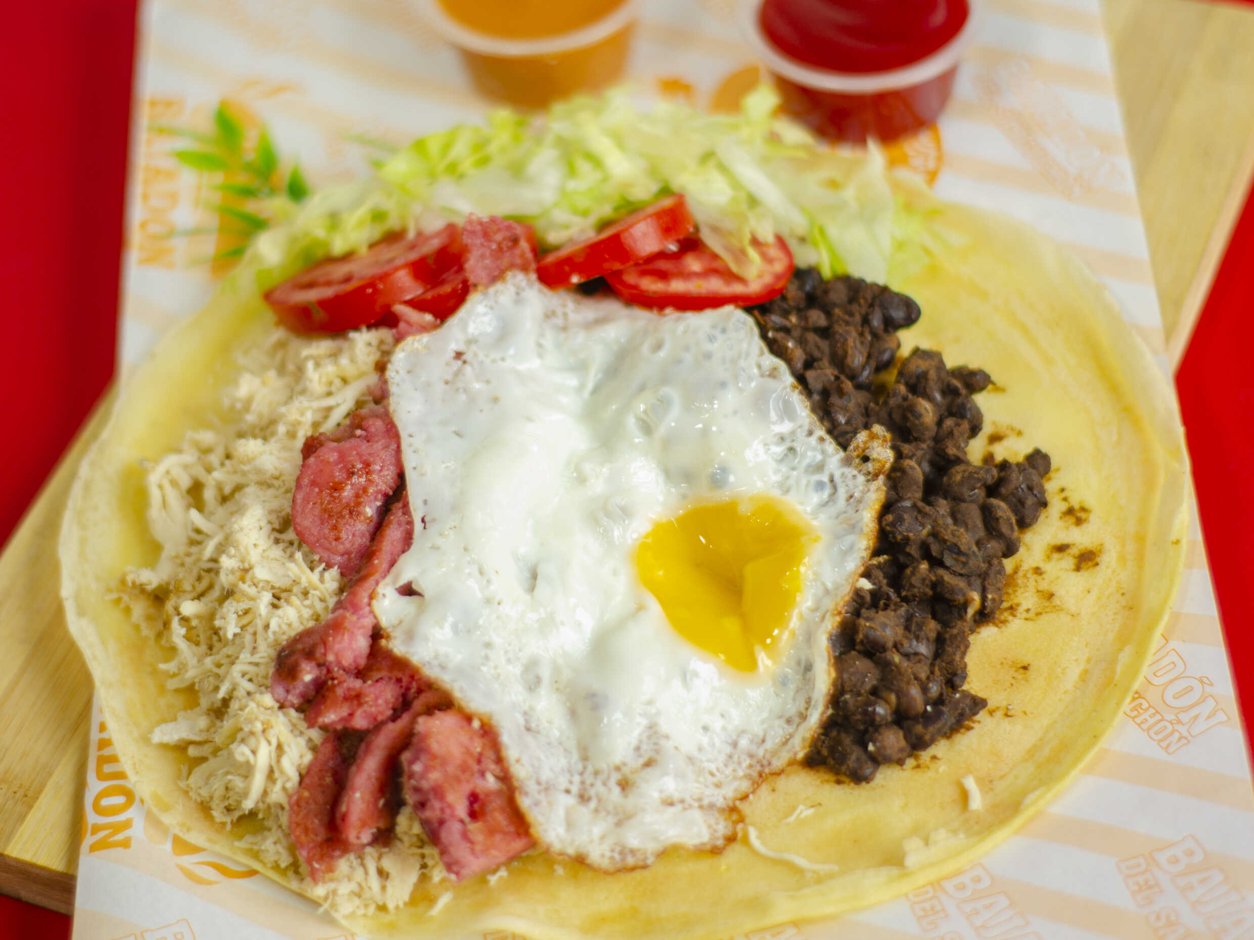 Tortilla de maíz, frijol negro, pollo deshilachado, chorizo y huevo.