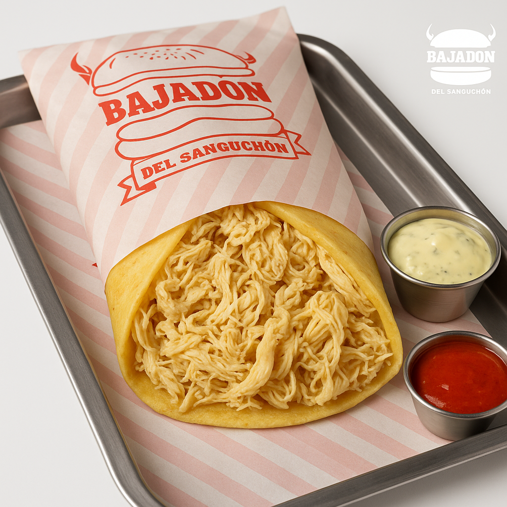 Tortilla de maíz, 3 quesos y suprema de pollo.