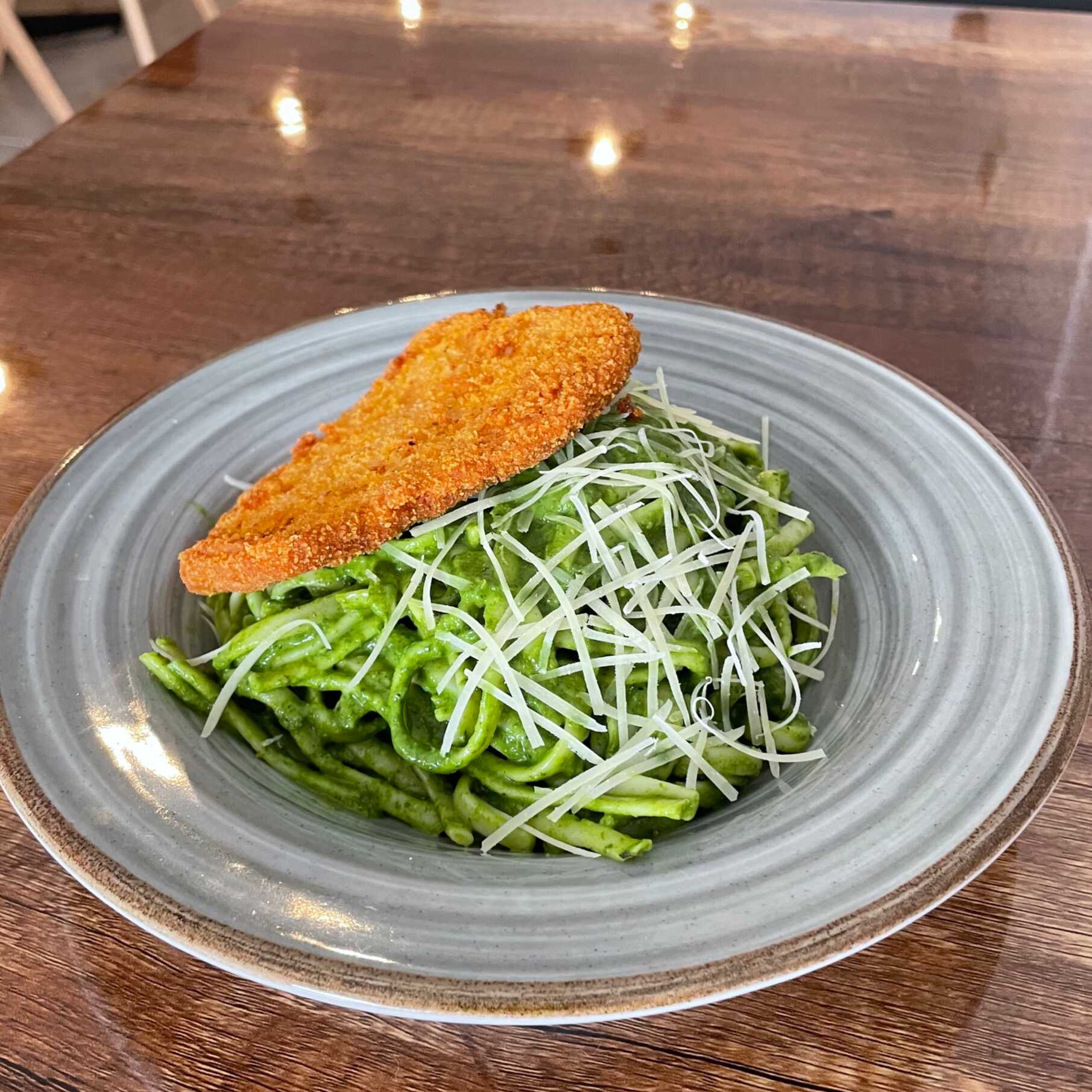 Tallarin al Pesto con Milanesa Apanada